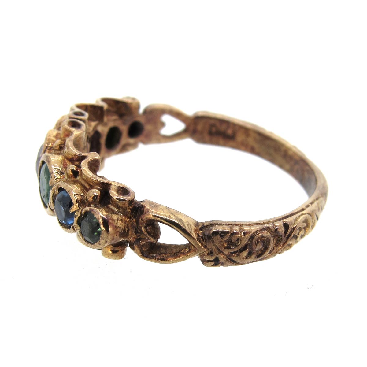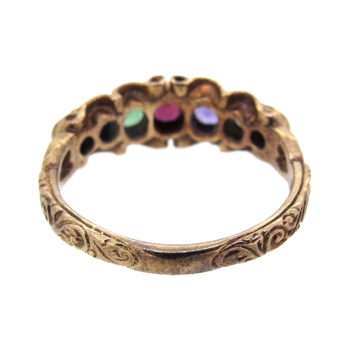 9 carat gold & multi gem ring. The stones diamond, emerald, amethyst, ruby, emerald, sapphire & tourmaline spelling out “dearest’. In a carved gold setting.