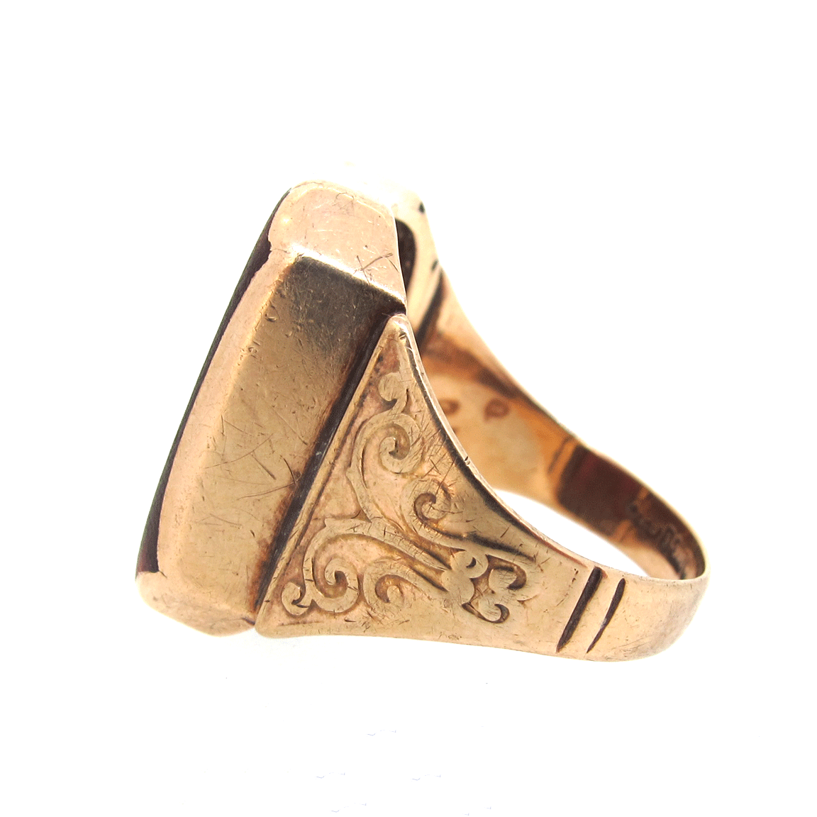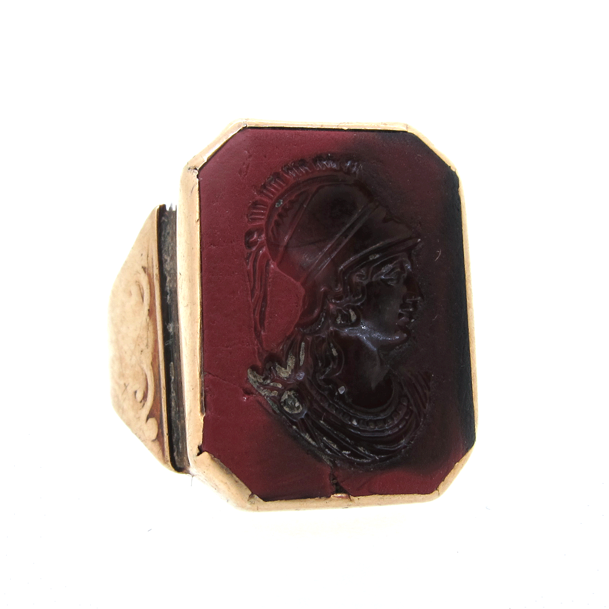 Antique 9 carat gold & agate intaglio ring. With a carved female portrait set into the agate & carved gold shoulders.