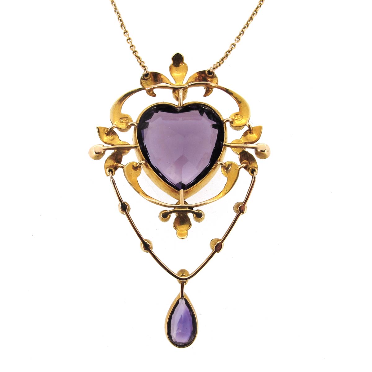 Antique Edwardian amethyst & seed pearl hinged heart necklace. Set in 15 carat gold.
