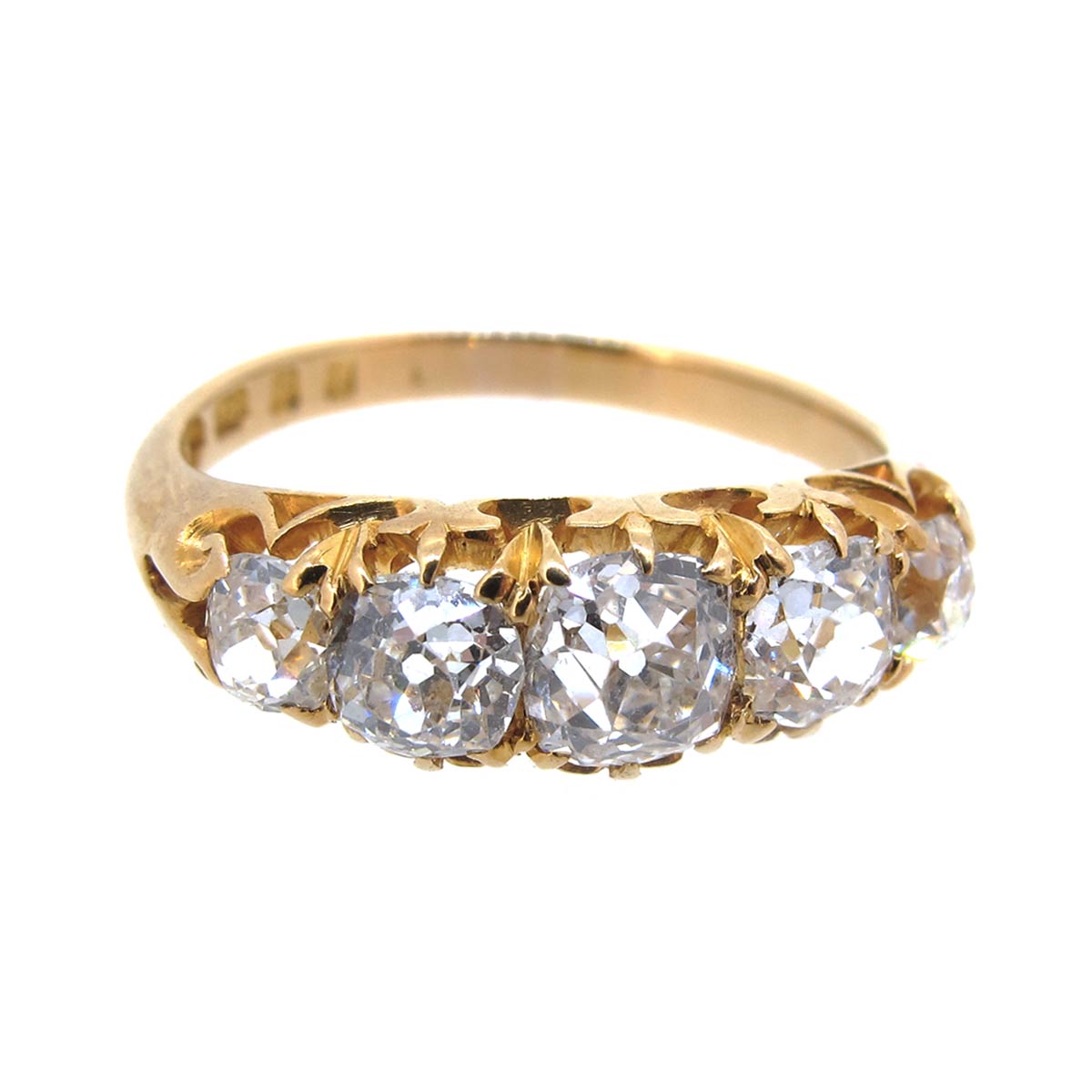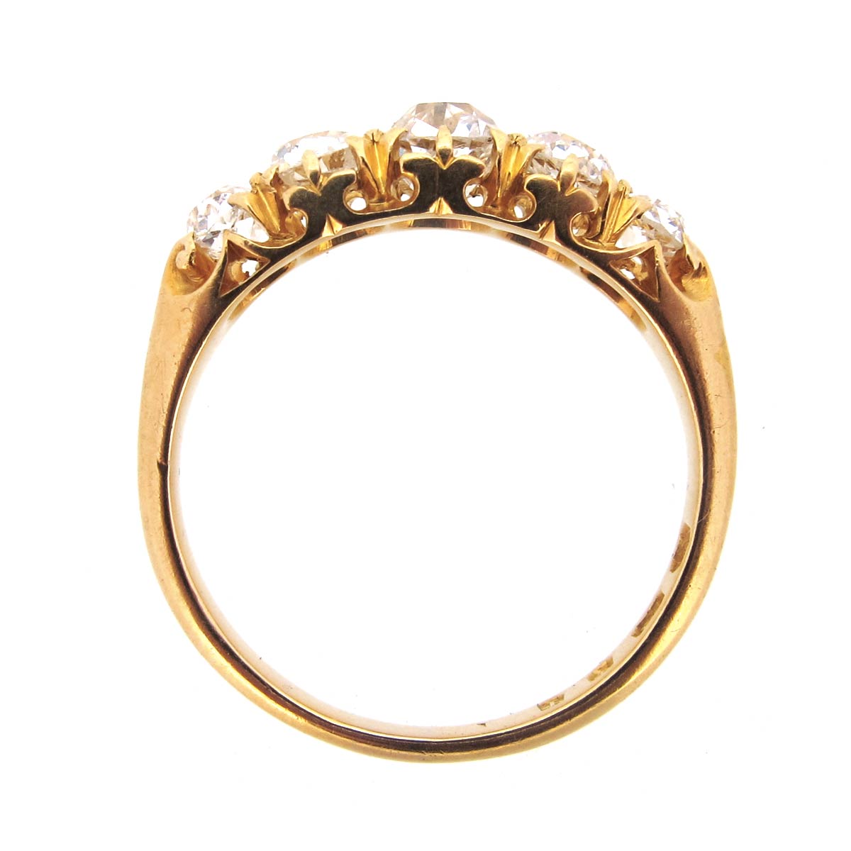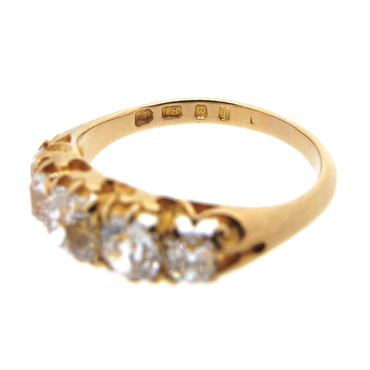 Hallmarked London 1866. Antique Victorian 5 stone old mine cut diamond ring. Total diamond weight approximately 1.30 carats.