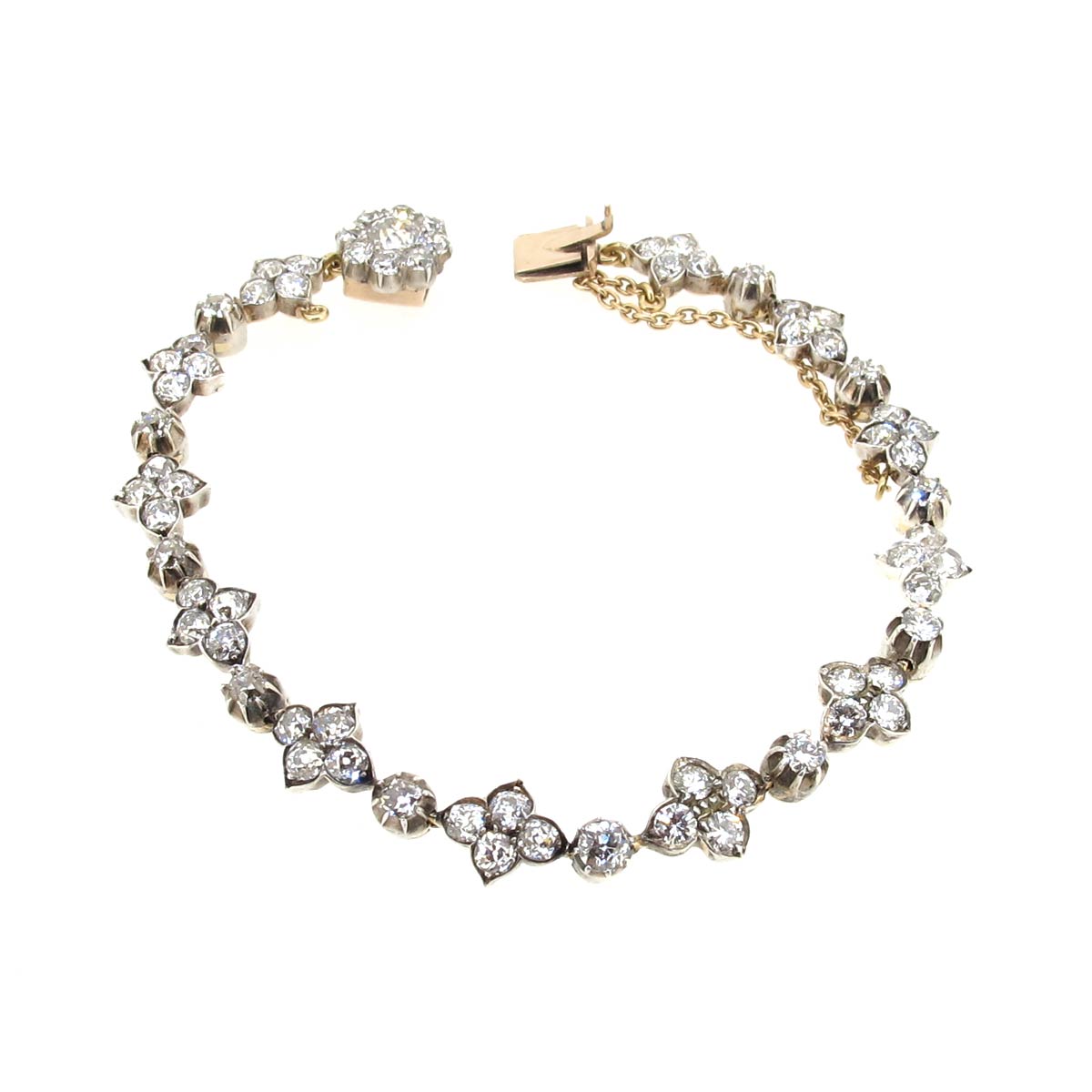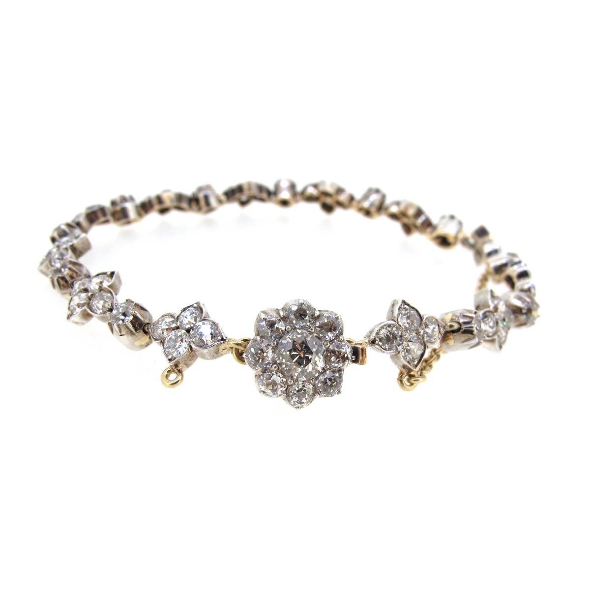 Antique Victorian diamond bracelet with diamond daisy cluster clasp. Total diamond weight approximately 7 carats. Set in silver on gold.