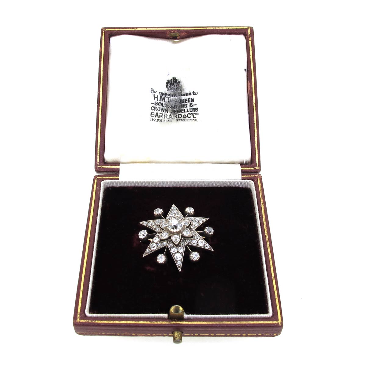 Antique Victorian old mine cut diamond starburst brooch. Set in silver on gold. In original fitted box.