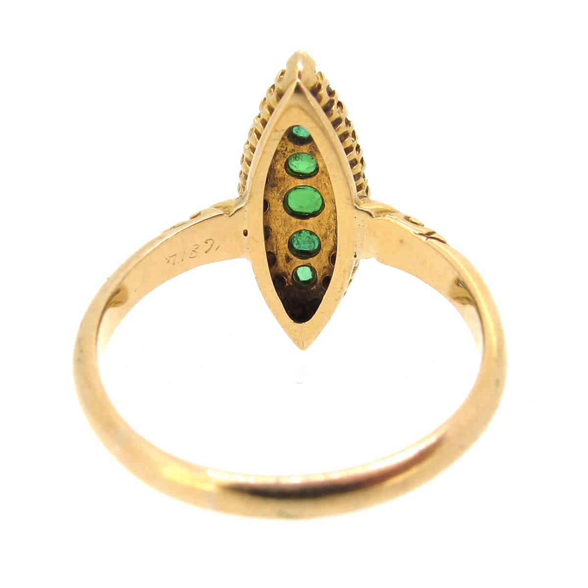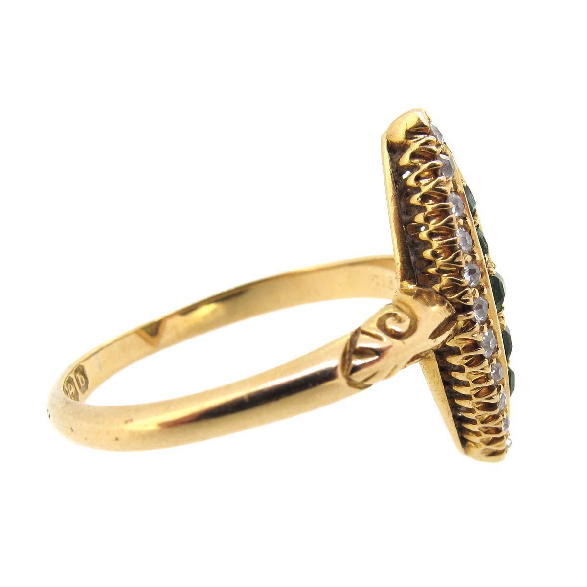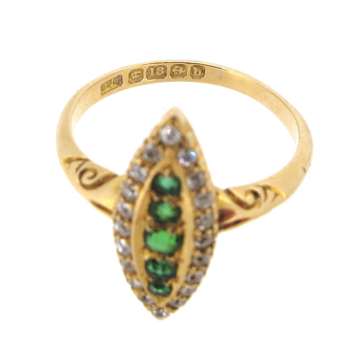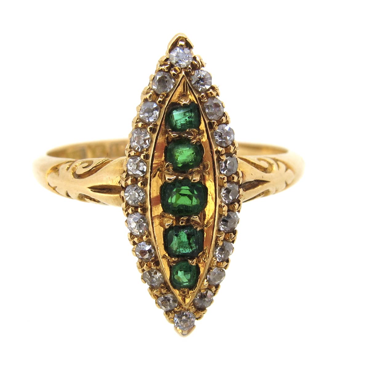 Birmingham, 1901, Victorian/ Edwardian emerald & diamond navette/ marquise shaped ring. Five central emeralds surrounded by old mine cut diamonds. In a carved 18 carat gold band. Size of navette 19 x 7mm.