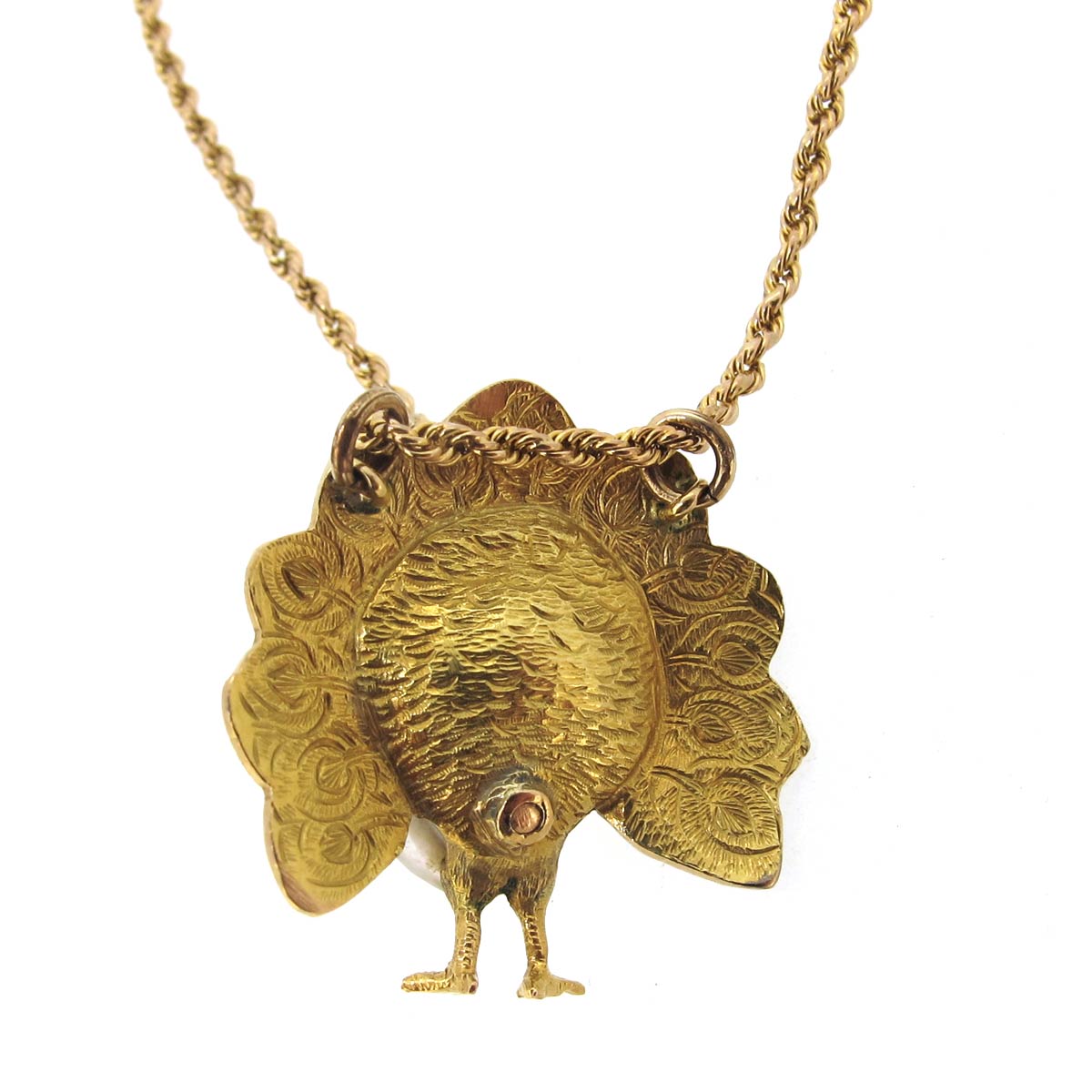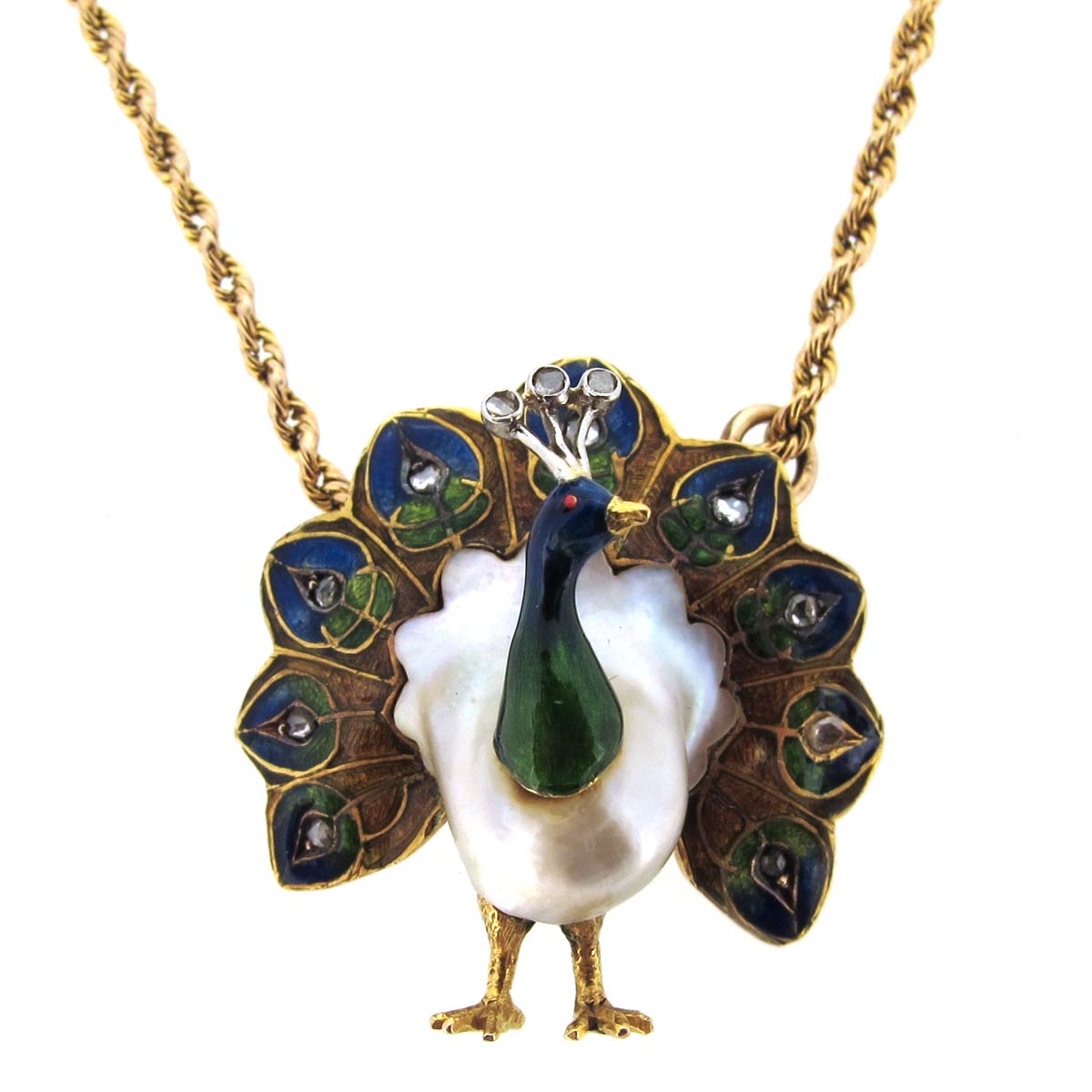 Antique Art Nouveau peacock necklace. Crafted in high carat gold with enamel & diamond detail, & bird’s body made of mother-of-pearl. Length of 9 carat gold chain 15″.