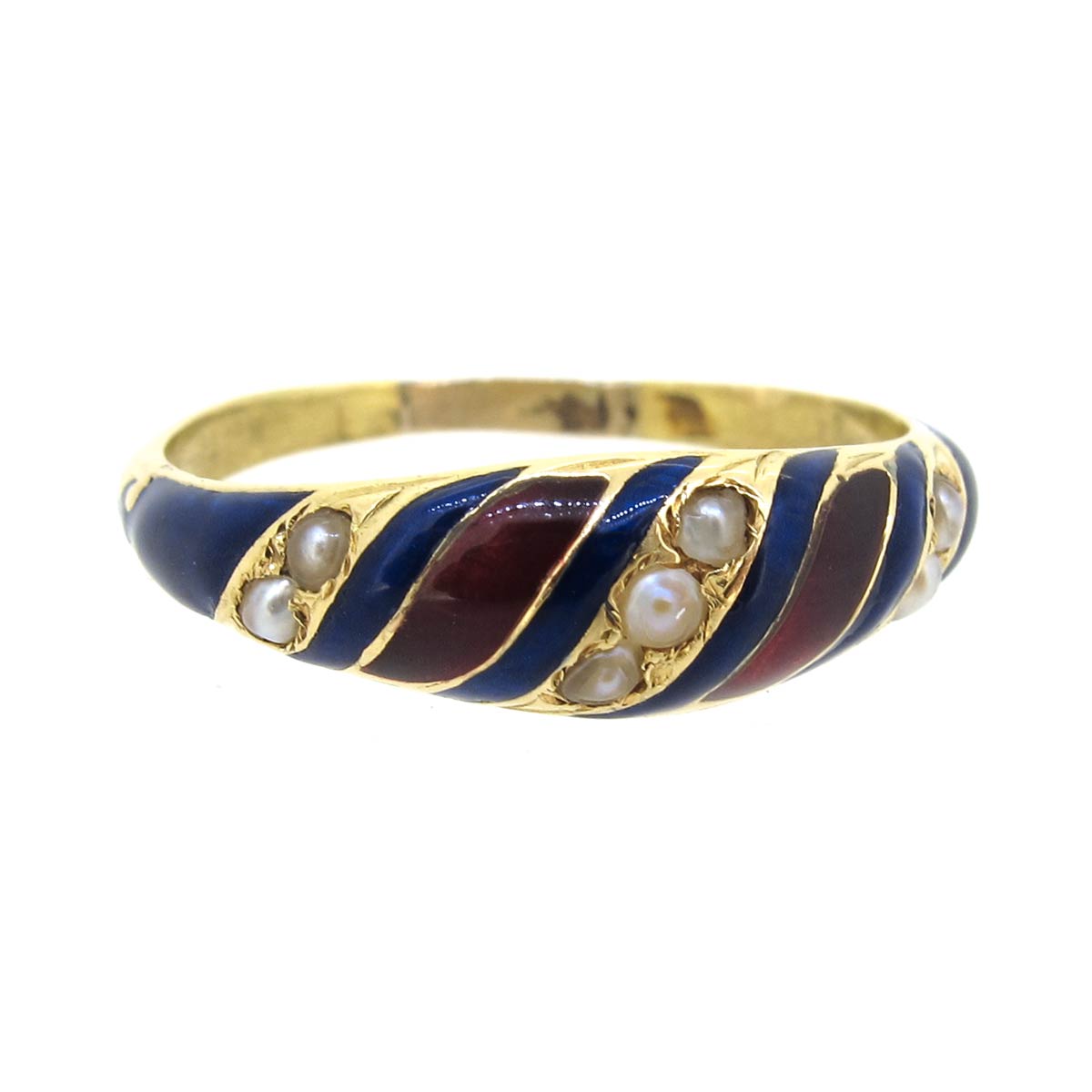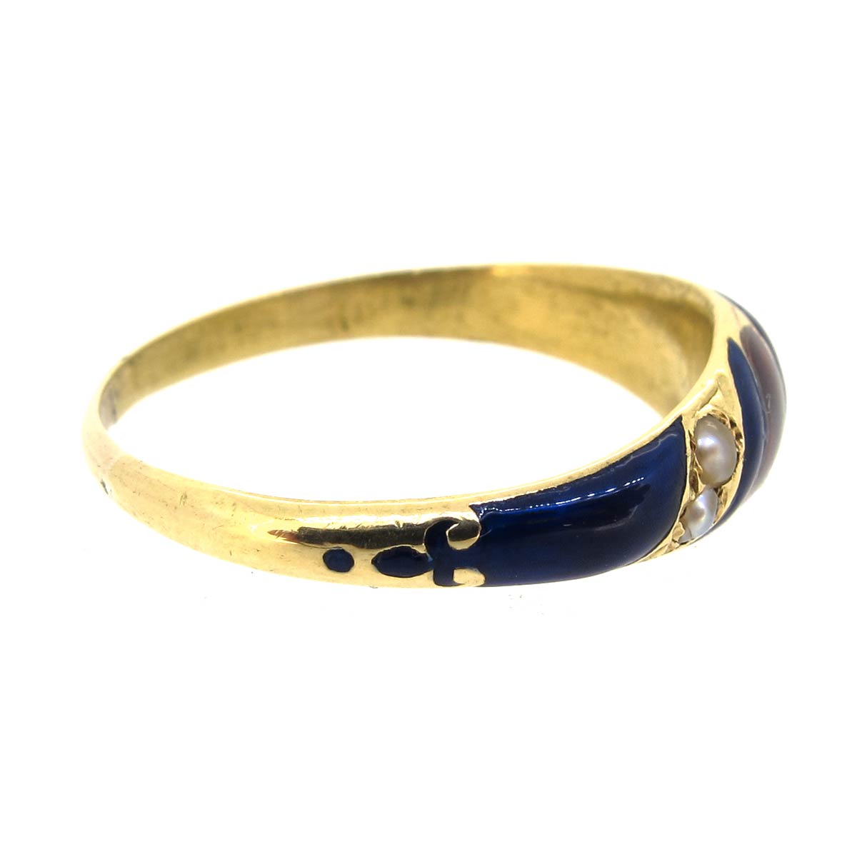 Antique Georgian/ Victorian 18 carat gold, blue & red enamel & seed pearl ring. With enamel fleur-de-lis detail to either side.