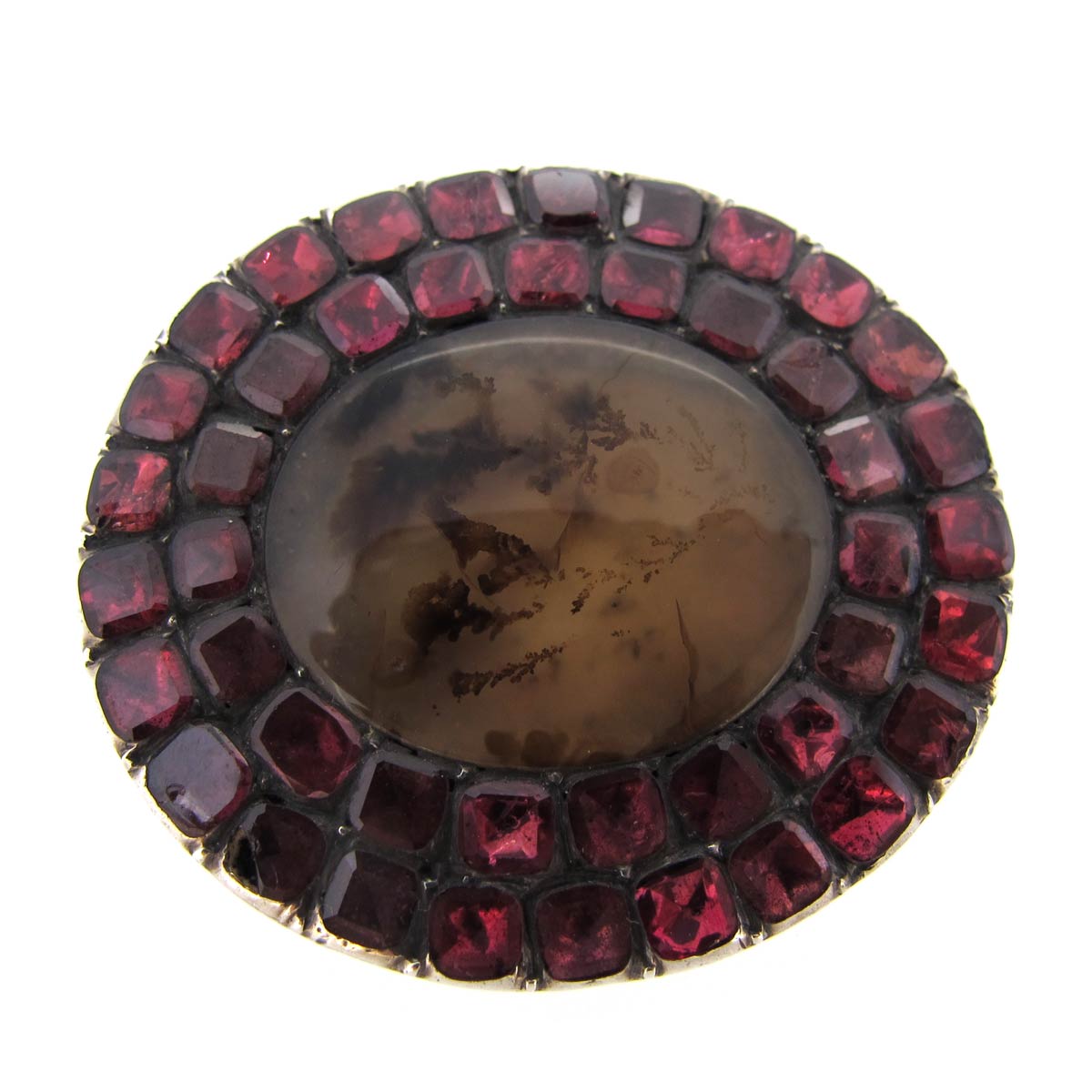 Antique Georgian or Victorian silver set flat cut garnet & dendritic agate brooch.