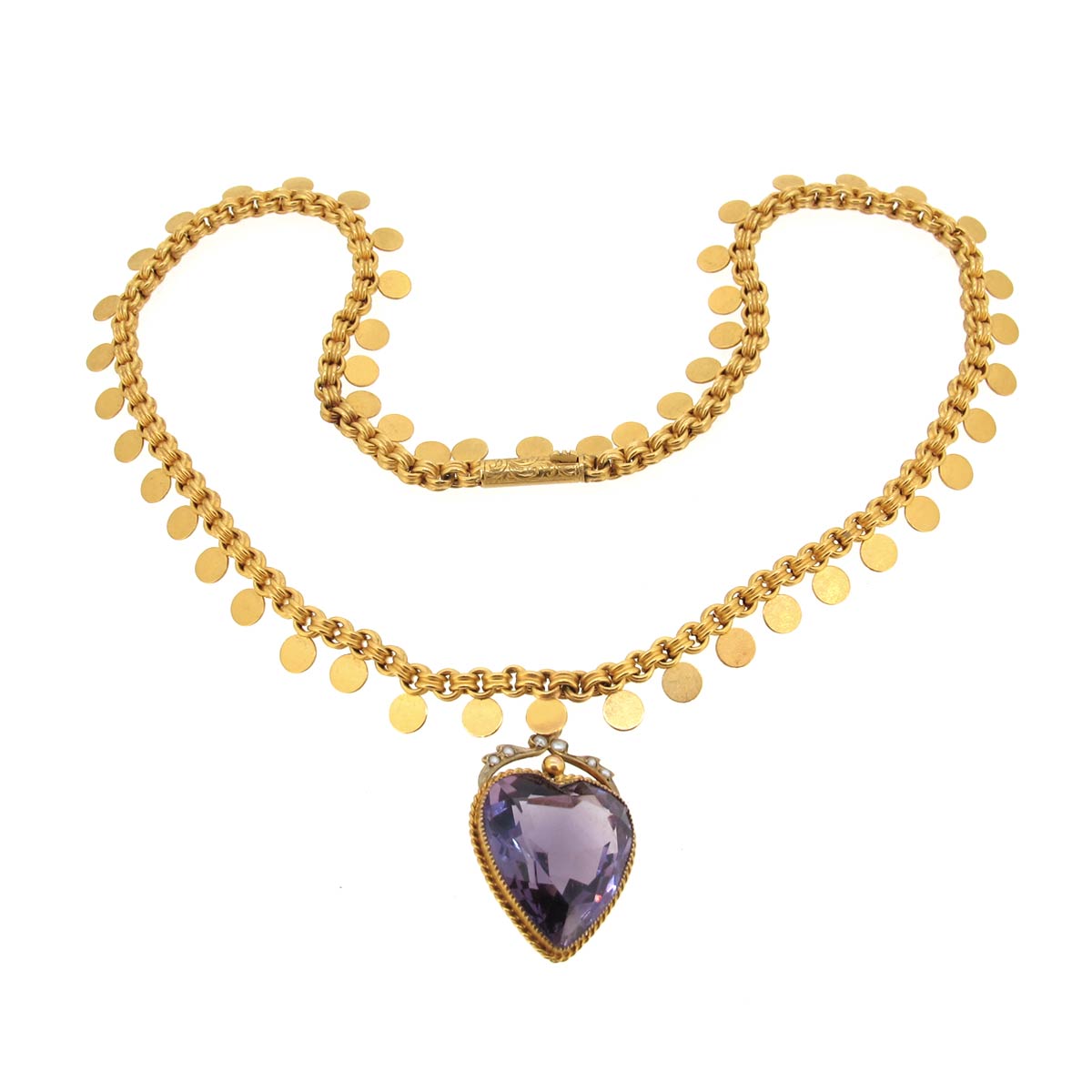 Antique Victorian 15 carat gold necklace/ collar made up of belcher & gold disk links. With an integral amethyst & seed pearl heart pendant & a carved barrel clasp. Length of chain 15″