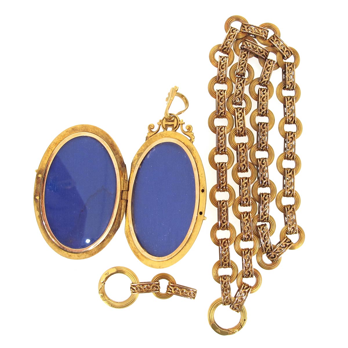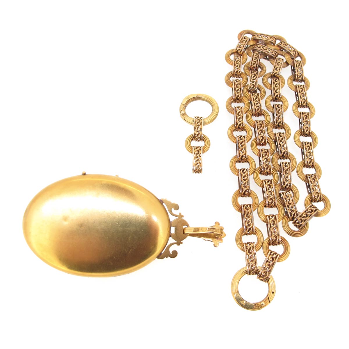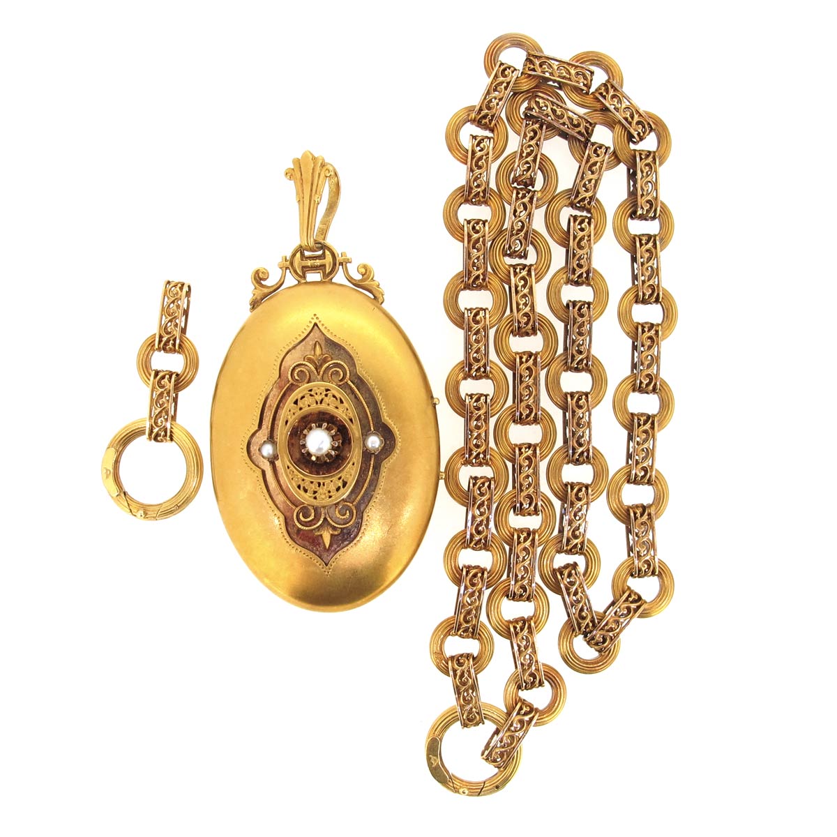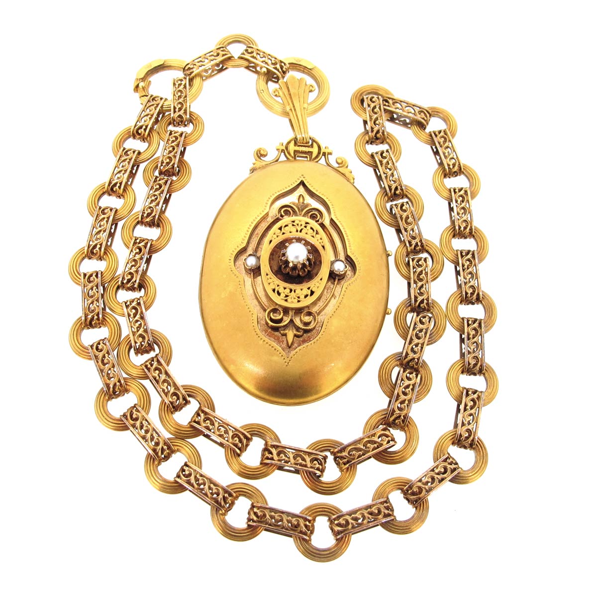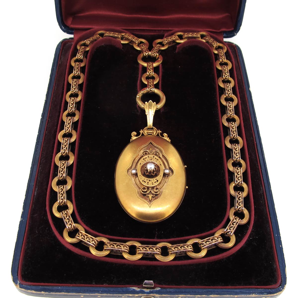Antique Victorian period Swedish 18 carat gold & pearl locket with 18 carat gold book chain necklace. In original fitted box. With detachable extender section.