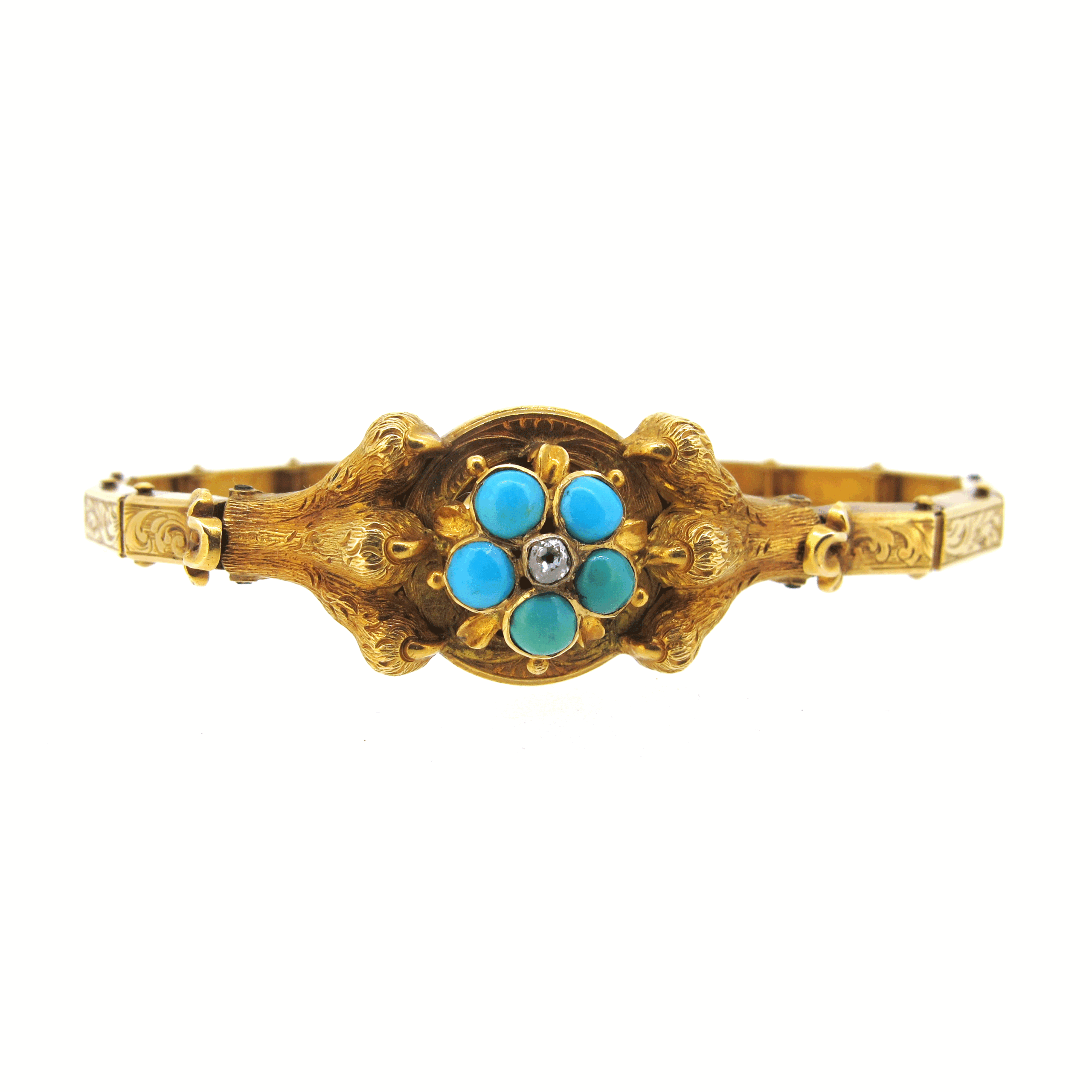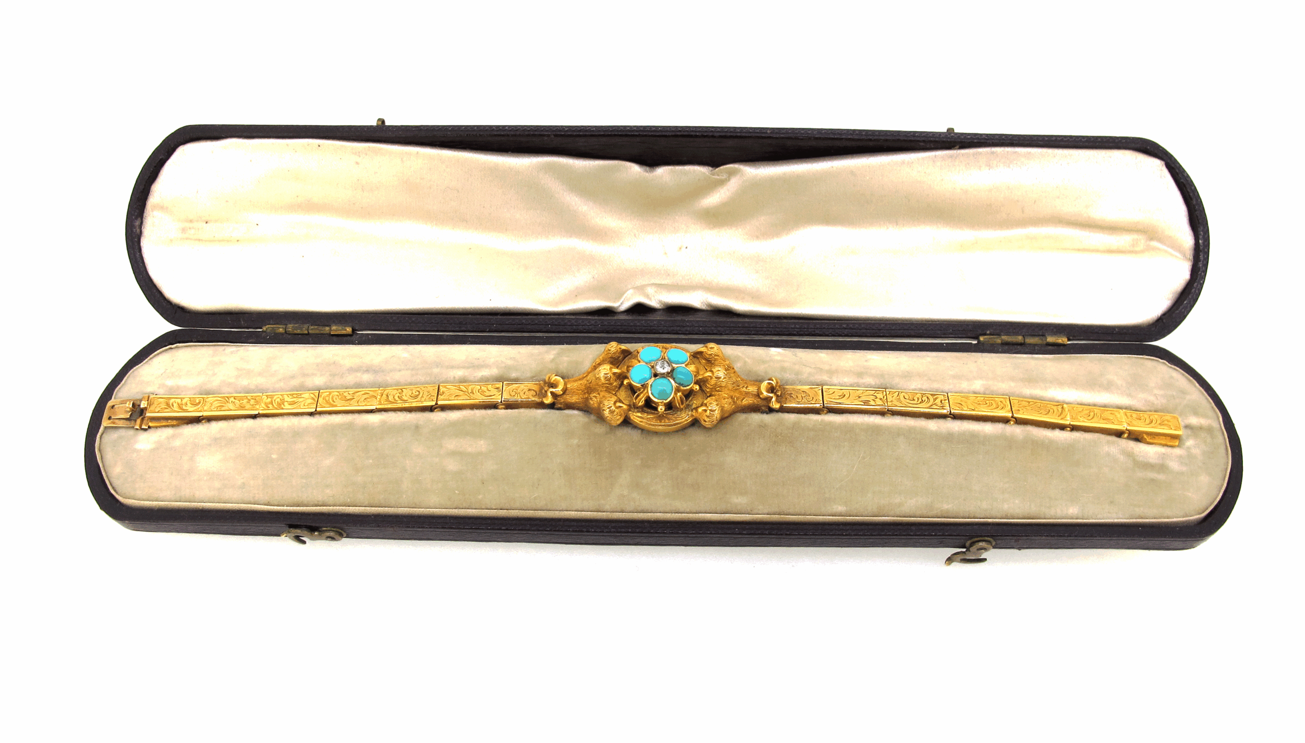 Antique Victorian 15 carat gold, turquoise & diamond bracelet. In original fitted box with extra attachments in a secret compartment. Central diamond & turquoise daisy cluster motif held by a pair of lion’s paws on a carved articulated bracelet. With an open locket section to the reverse. Length 7″.