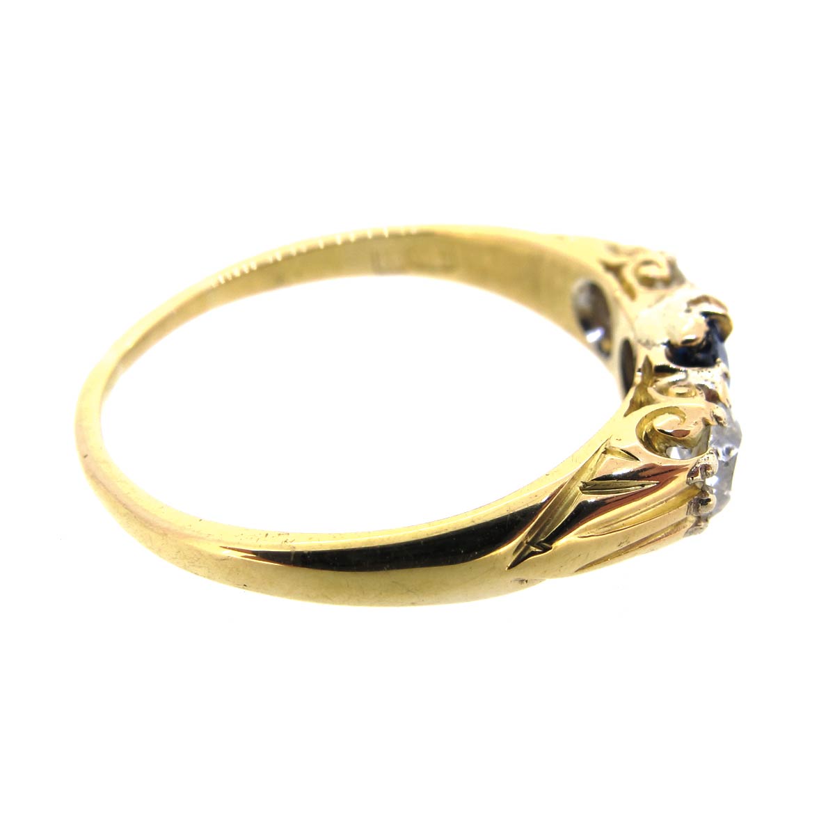 Antique Victorian/ edwardian sapphire & diamond 3 stone trilogy ring. In a carved 18 carat gold setting.
