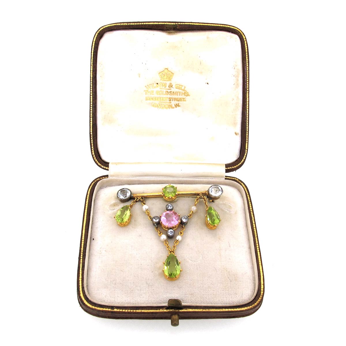 Antique Edwardian, circa 1905, Suffragette brooch. Peridot, tourmaline, white sapphire & rose cut diamonds set to a 15 carat gold brooch. In original fitted box.