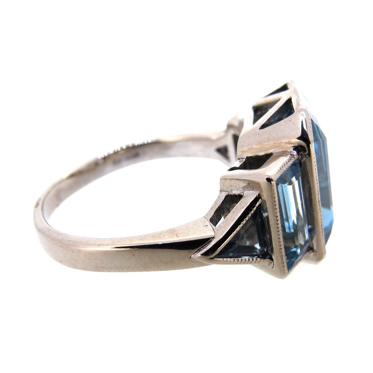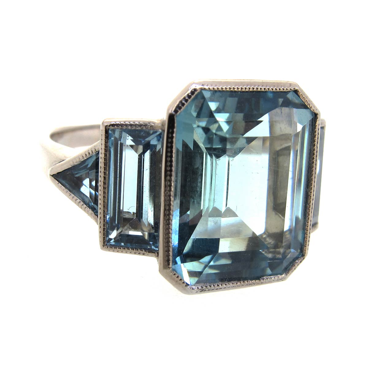 Vintage Art Deco style aquamarine cocktail ring set in 18 carat gold. Central emerald cut aquamarine weighing approximately 10 carats. With stepped baguette cut & trapezium cut aquamarine shoulders.