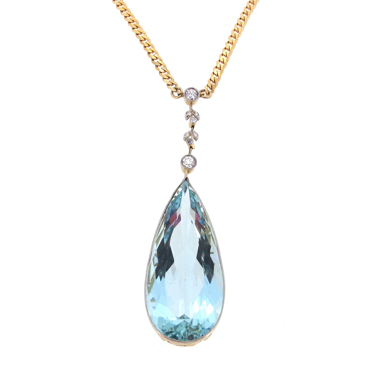 Pear shaped aquamarine & diamond pendant necklace. Aquamarine of approximately 25 carats suspended from an articulated diamond drop section.