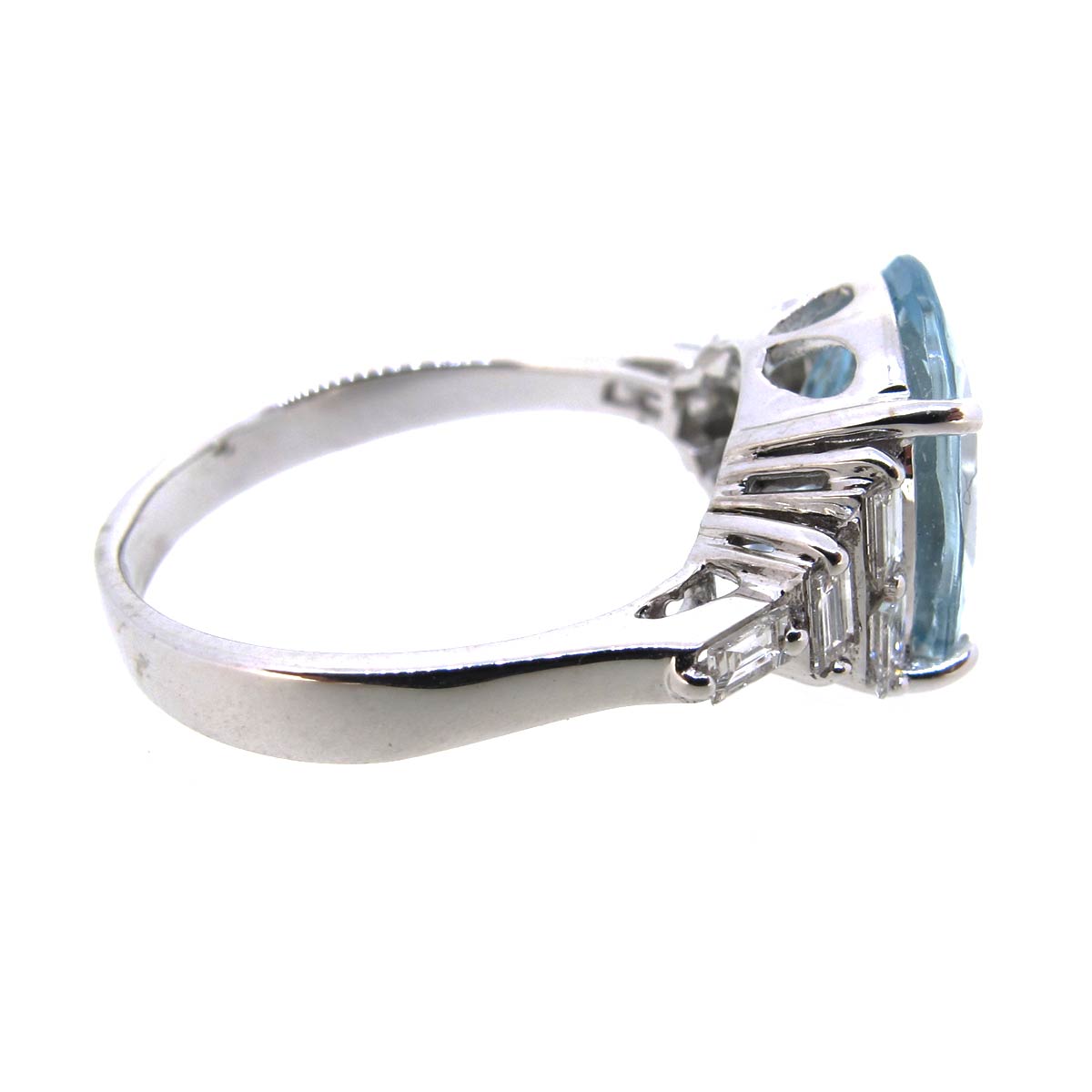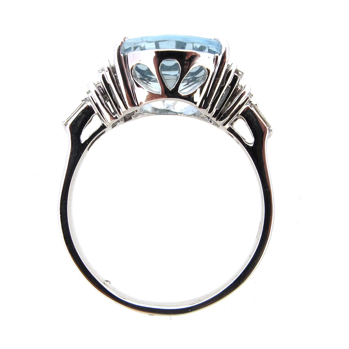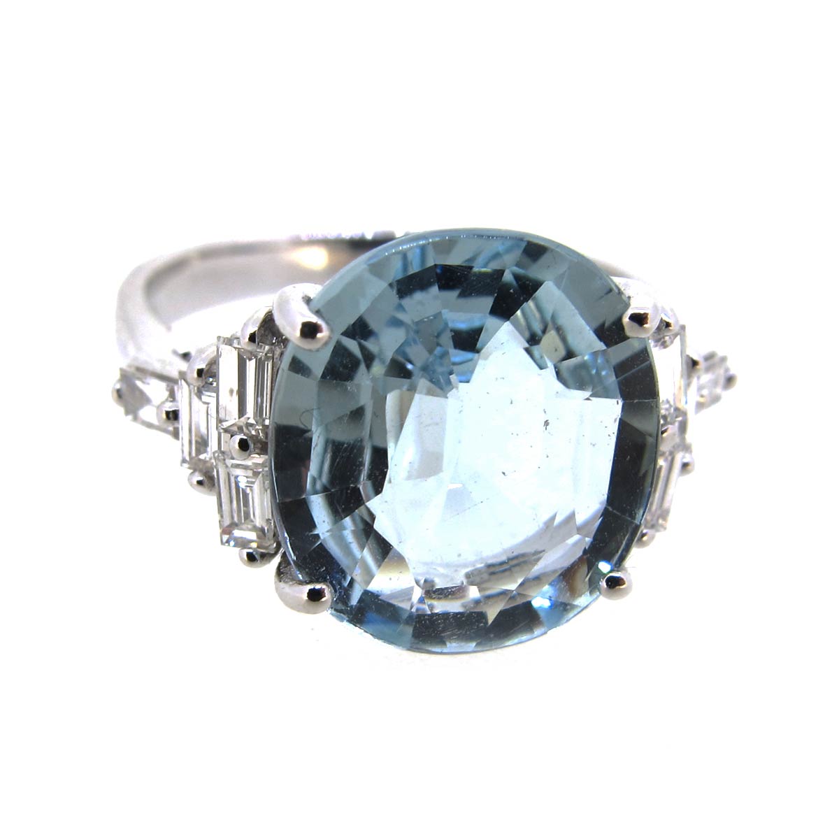 Art Deco period, circa 1930s/ 1940s, aquamarine & diamond cocktail ring. Central round aquamarine weighing approximately 6 carats with 4 baguette cut diamonds set to either shoulder. In 18 carat white gold.