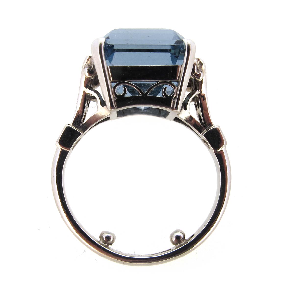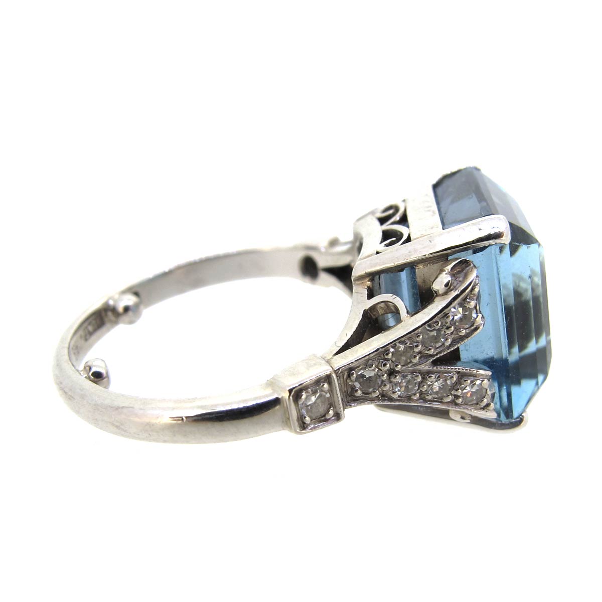 Art Deco period, 1920s/ 1930s, aquamarine & diamond cocktail ring. Central square cut aquamarine of approximately 6.5 carats with diamond set split shoulders. Set in platinum.