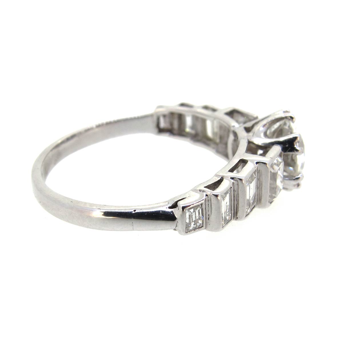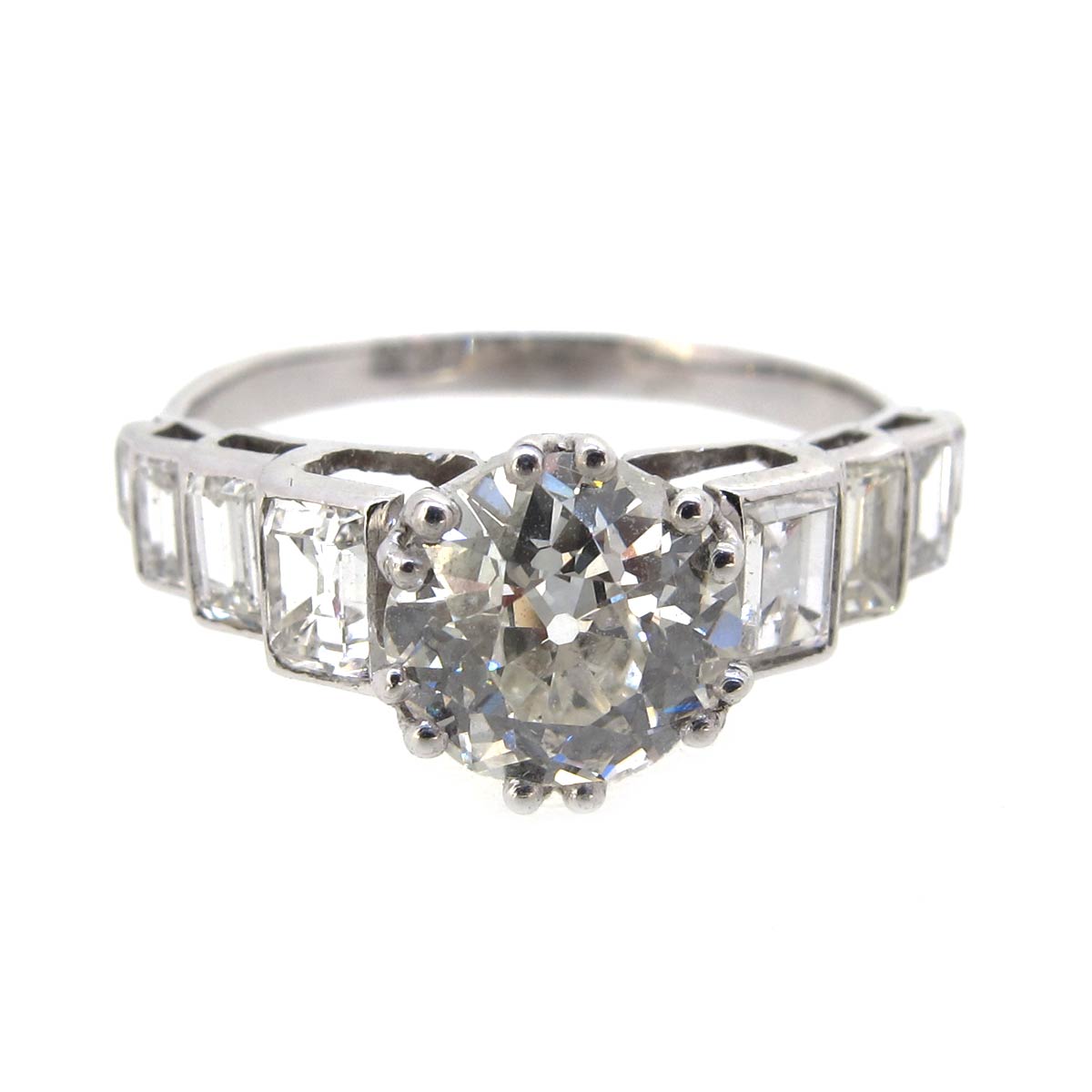 Art Deco period, circa 1930s, platinum & diamond ring. Central old cut diamond 1.38 carats, approximately G/ H colour, SI1 clarity. With stepped emerald cut diamond shoulders.