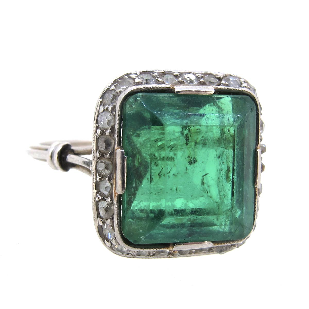 Antique Art Deco period emerald & diamond ring. Central square cut certified Columbian emerald weighing 6.53 carats surrounded by old cut diamonds. Set in platinum.