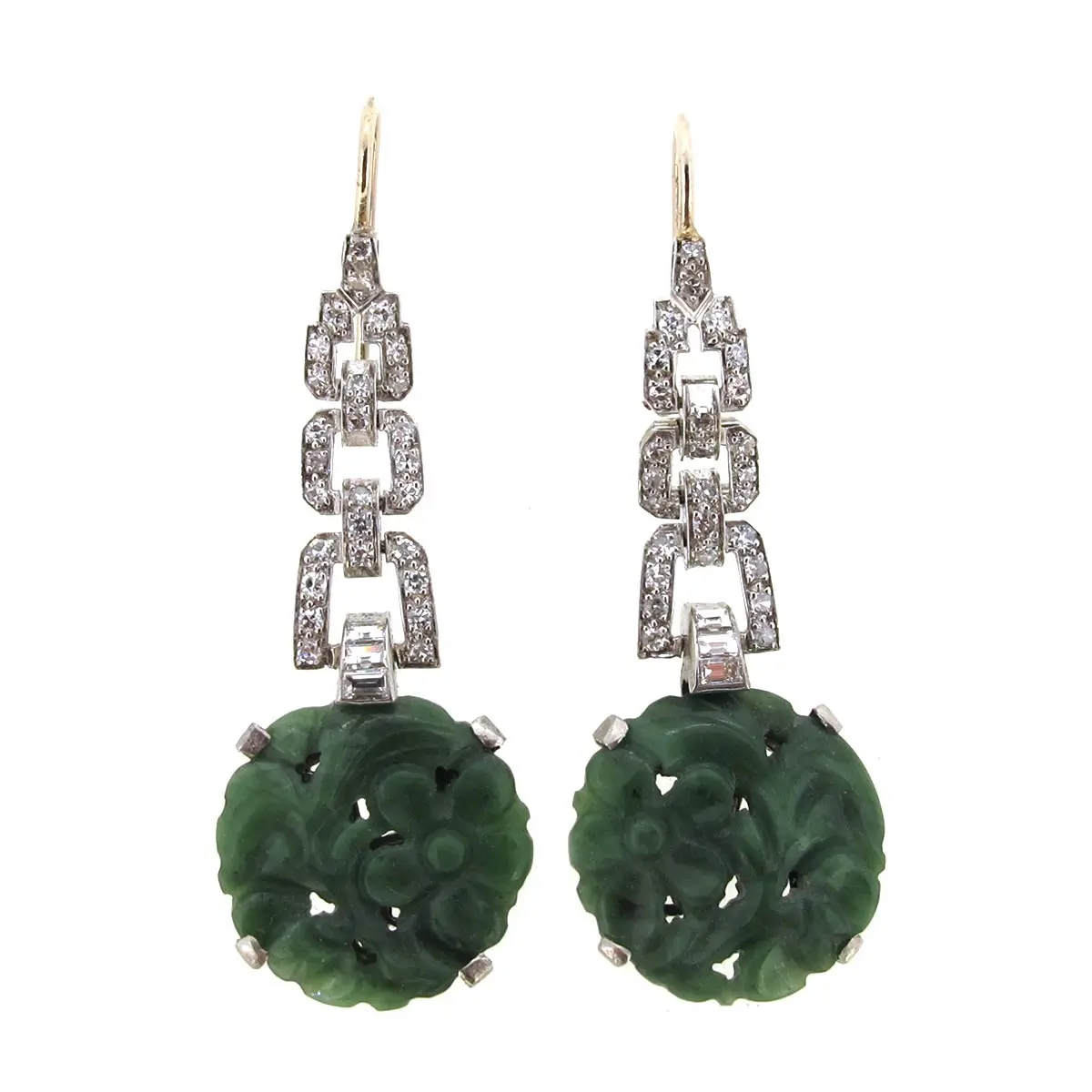 Art Deco period, circa 1920s/ 1930s, carved jade & round & baguette cut diamond drop earrings. Set in 18 carat gold/ platinum. Length of drop 48mm.