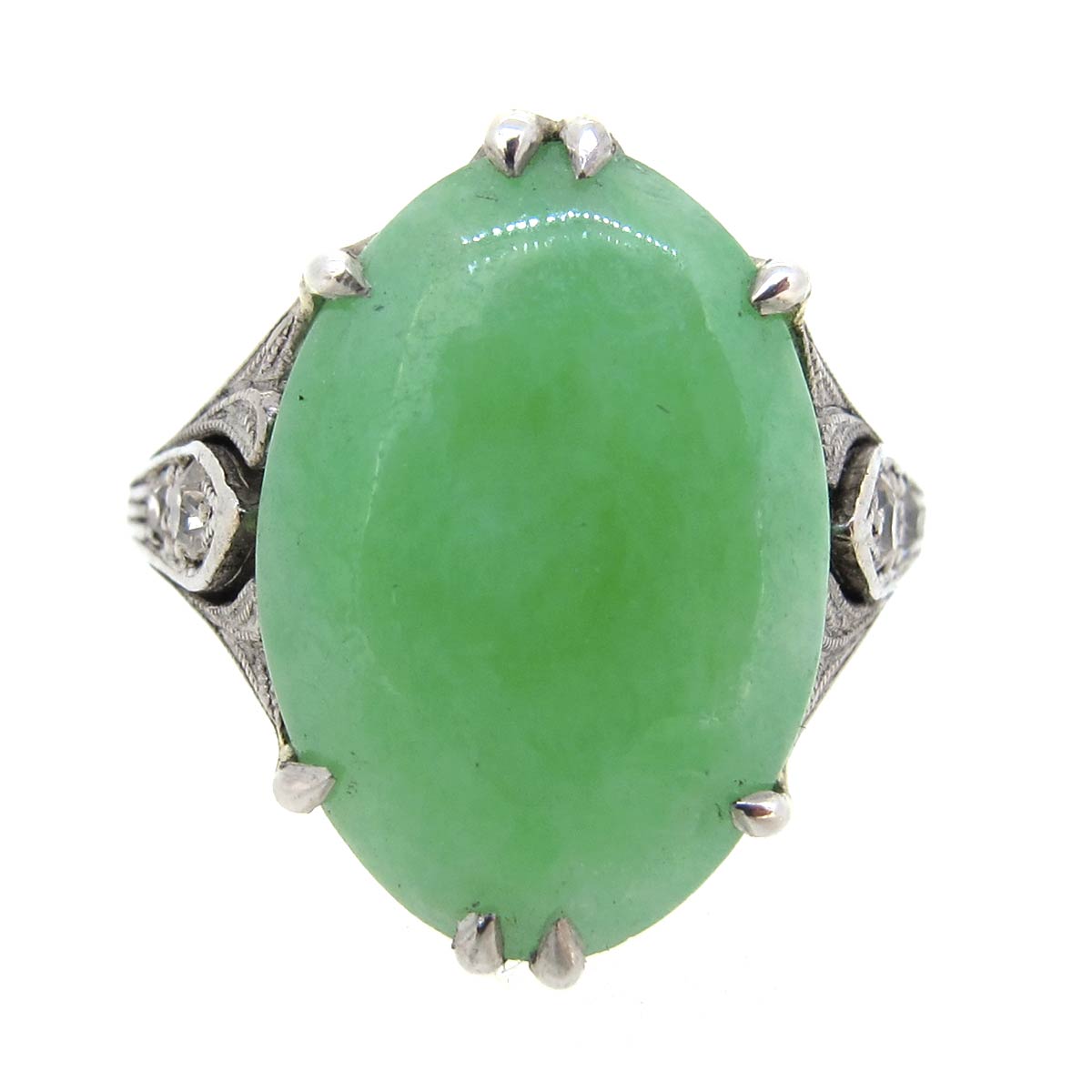 Art Deco period, circa 1920s, jade ring. Set in platinum with diamond set shoulders.