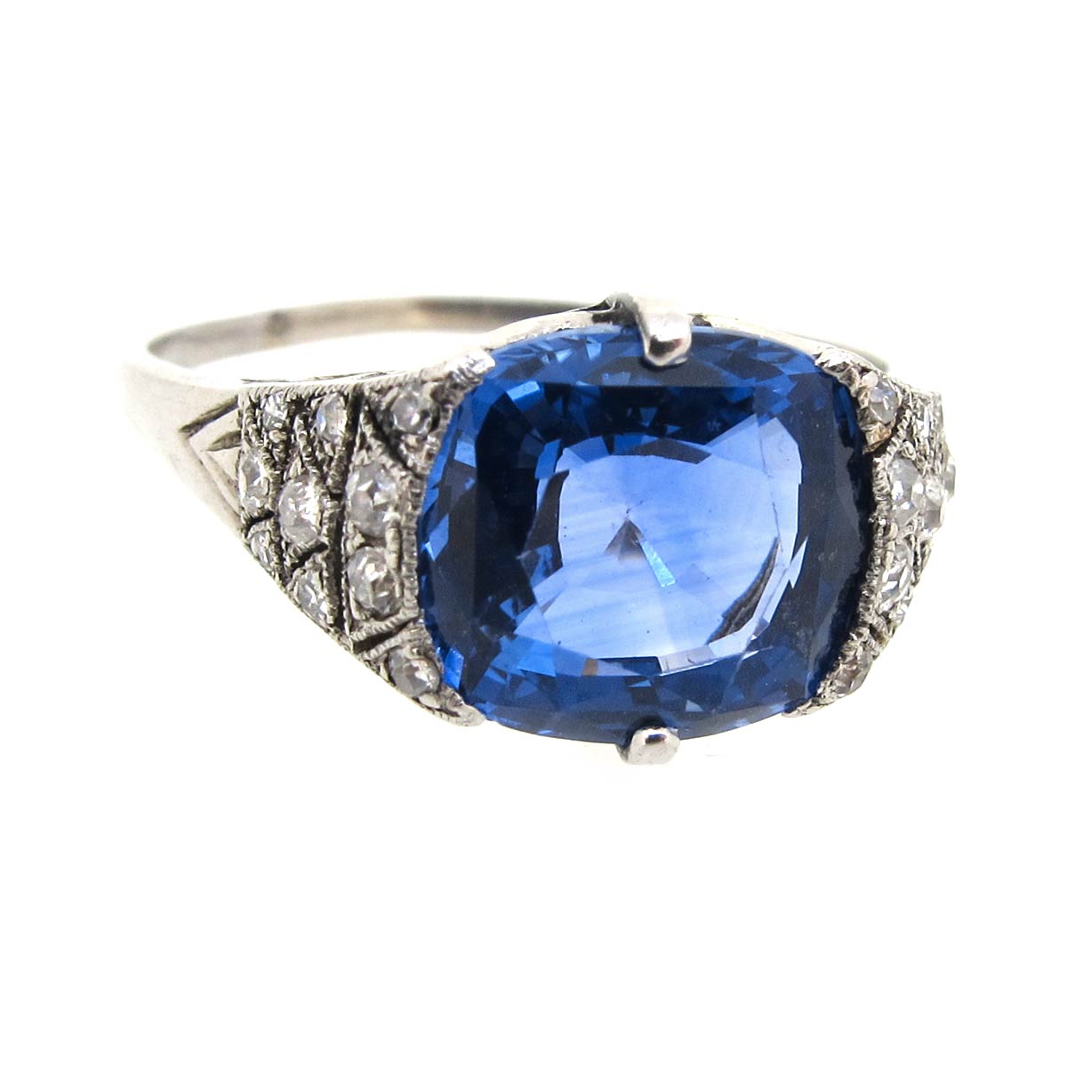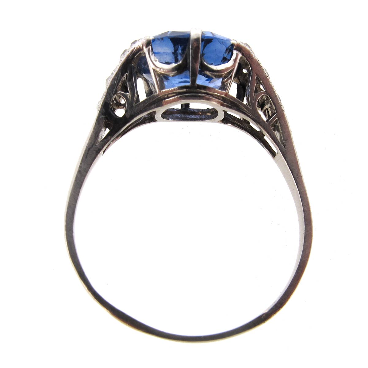 Art Deco period, circa 1920s/ 1930s, sapphire & diamond single stone ring. Central sapphire no heat & approximately 2.25 carats. Set in platinum with diamond set filigree shoulders.