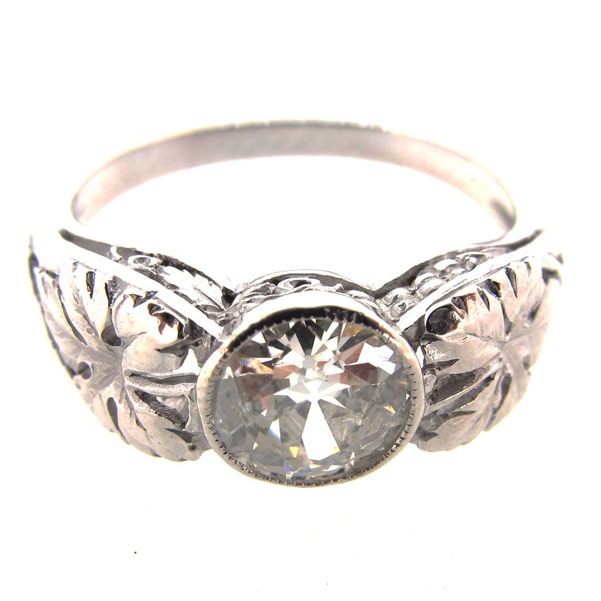 Antique Art Nouveau period, circa 1910, platinum & rub over set diamond solitaire engagement style ring. Diamond approx 1ct, H/I colour, SI2 clarity. In carved leaf design platinum setting with leaf & grape design also to the gallery
