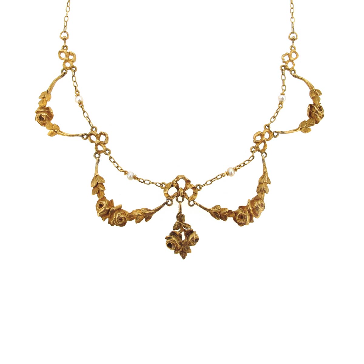 Antique Art Nouveau/ Belle Époque 18 carat gold & seed pearl necklace. Length 17.5″, weight 16.36g.