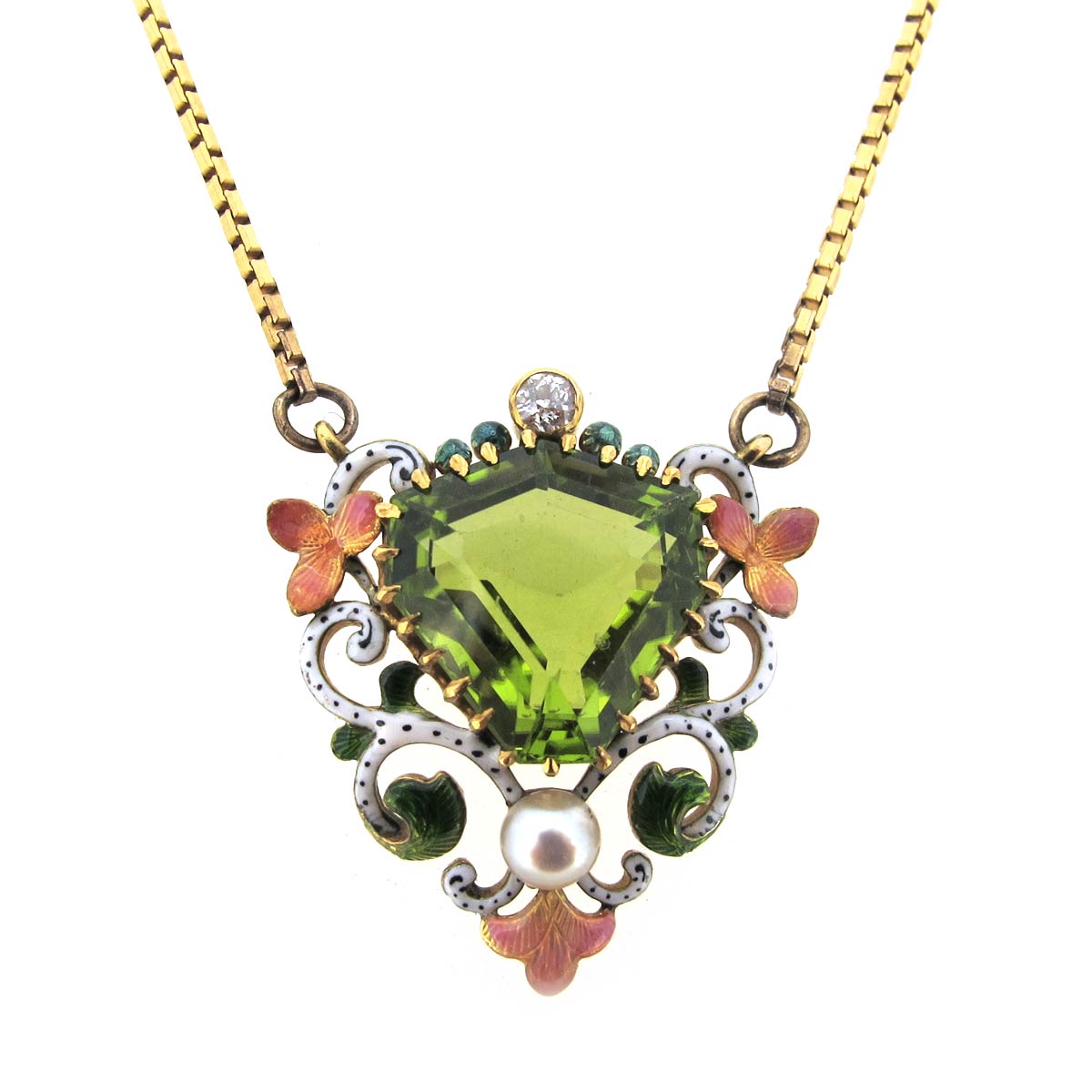 Arts & Crafts/ Art Nouveau era, circa 1905, peridot, enamel, diamond & pearl necklace. Set in gold. Length 20.5″.