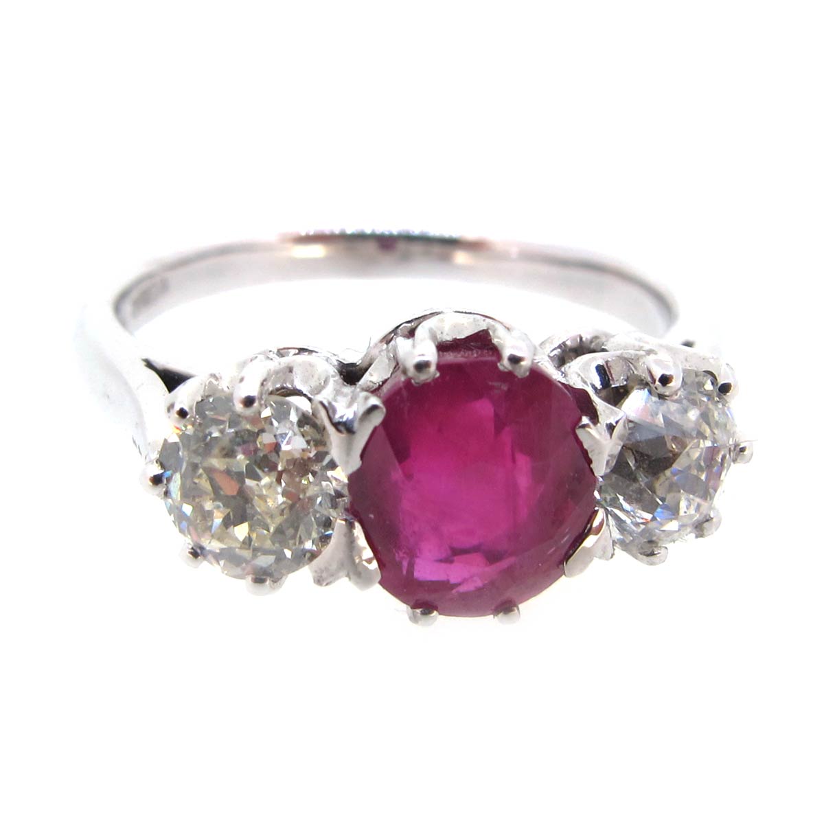 Burma (no heat) ruby & old mine cut diamond 3 stone ‘trilogy’ ring. Central ruby 2.24 carats, total weight of old mine cut diamonds 1.05 carats.