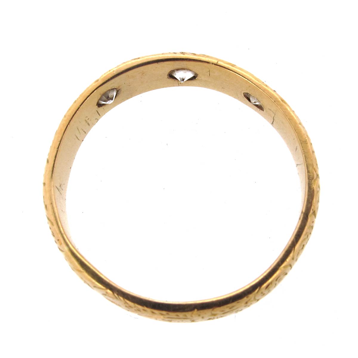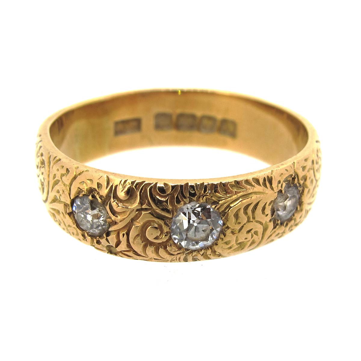Hallmarked London, 1907, antique carved 18 carat gold band ring. With three diamonds set to the band. Width 5.5mm.