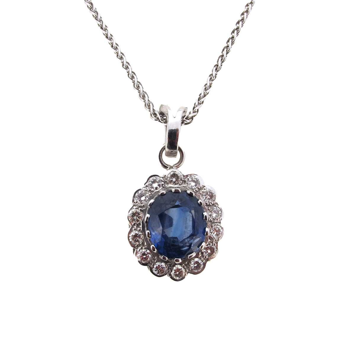Ceylon sapphire & diamond necklace. Sapphire weight approximately 6.20 carats. Set in 14 carat gold with 17″ 14 carat gold chain included (can also be worn at 14″). Size of cluster 20 x 17.5mm.