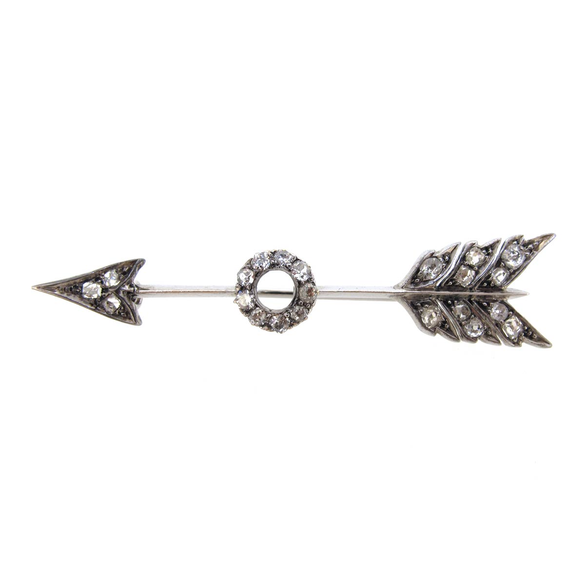Antique Victorian diamond arrow brooch. With central target section. Set in silver on gold. Length 6cm.