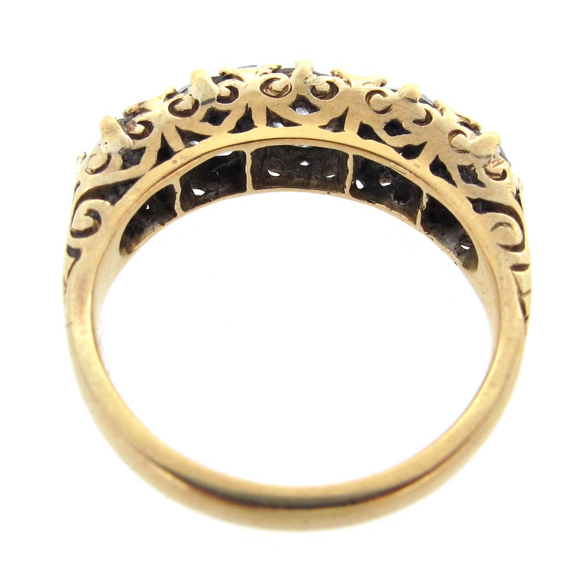 Antique Victorian style 5 stone old mine cut diamond carved half hoop ring set in 18 carat gold.