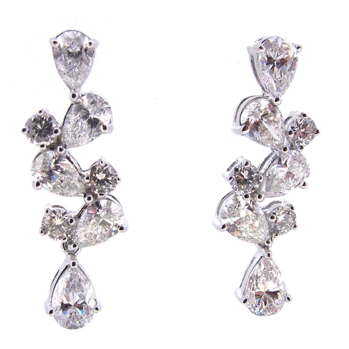 Multi-diamond drop earrings with a mixture of pear shaped & round brilliant cut diamonds. Total diamond weight approximately 4 1/2 carats, average G/H colour, VS2 clarity. Length of earrings 24mm. Set in 18ct white gold.