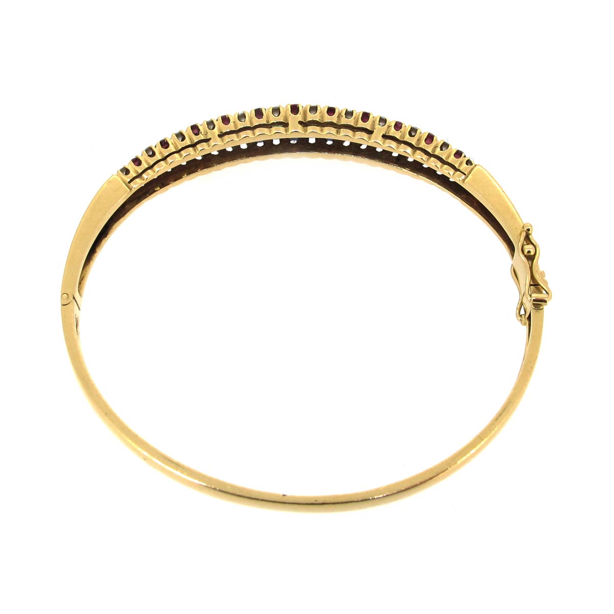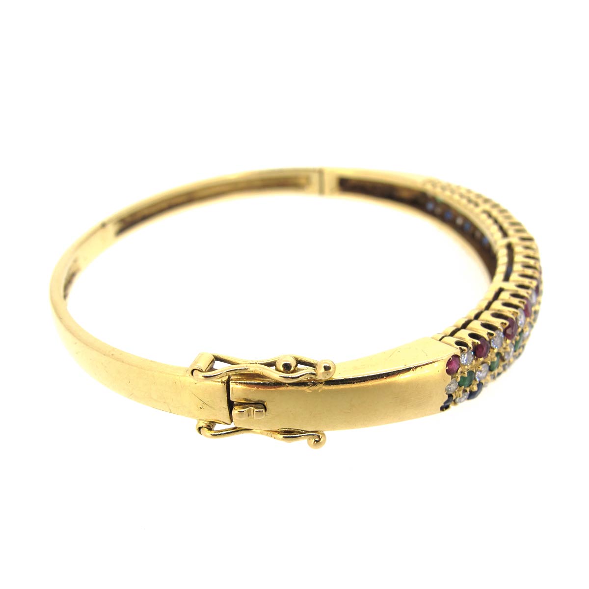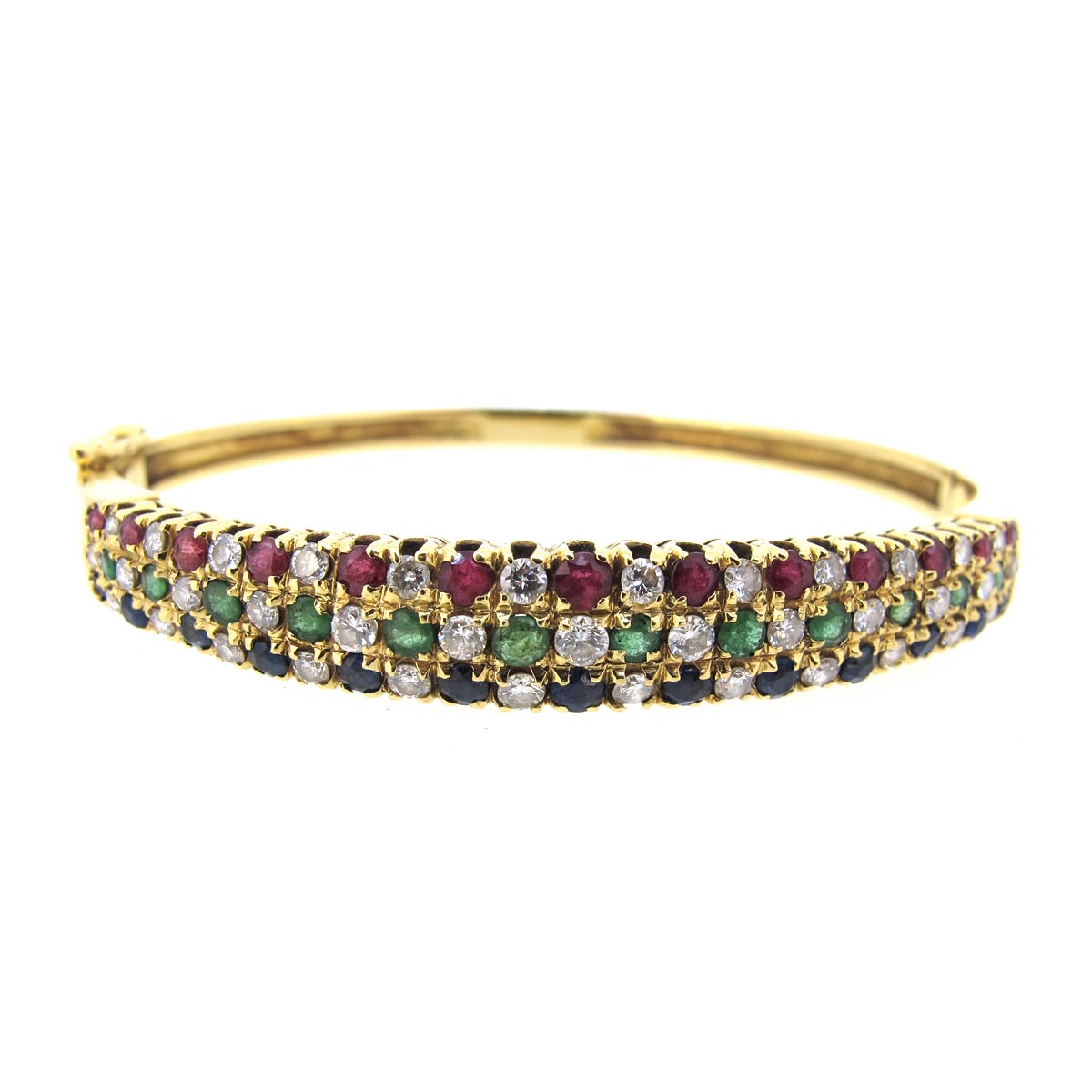 Vintage 18 carat gold bangle. Set with 3 rows of rubies, emeralds & sapphires interspersed with diamonds. Inside diameter 6cm, weight 21.61 grams.
