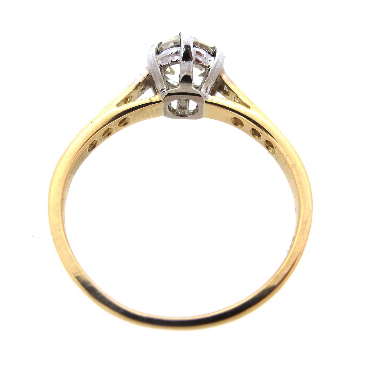 Victorian old mine cut diamond single stone ring with 5 diamonds set to either shoulder. Set in 18 carat gold. Central diamond approximately .80 carats, J/K colour, SI clarity.