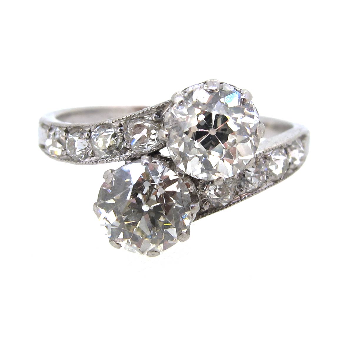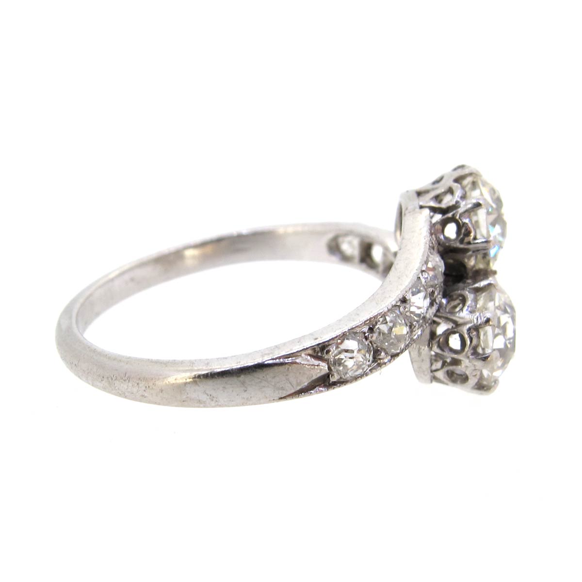 Antique Art Deco diamond toi-et-moi ring. With 4 diamonds set to either shoulder. Total diamond weight of 2 main stones approximately 1.5 carats, average H/I colour, VS2/SI1 clarity.