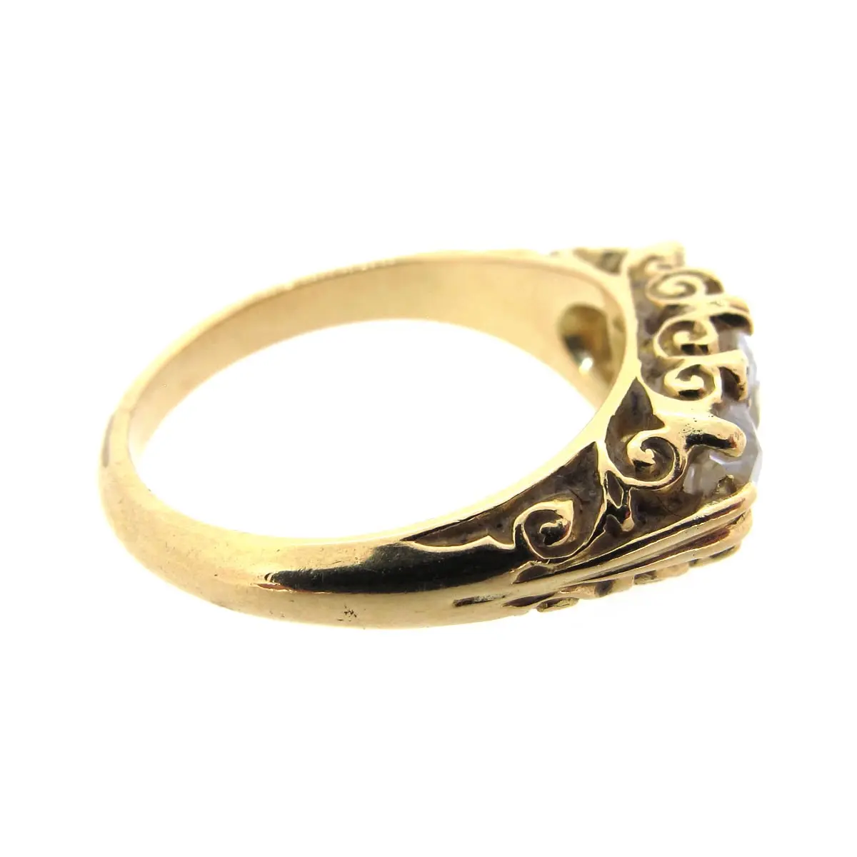 Antique Victorian 3 stone old mine cut diamond ring in an 18 carat gold carved half hoop setting. Total diamond weight approximately 1.80 carats, average F/G colour, VS1/2 clarity.