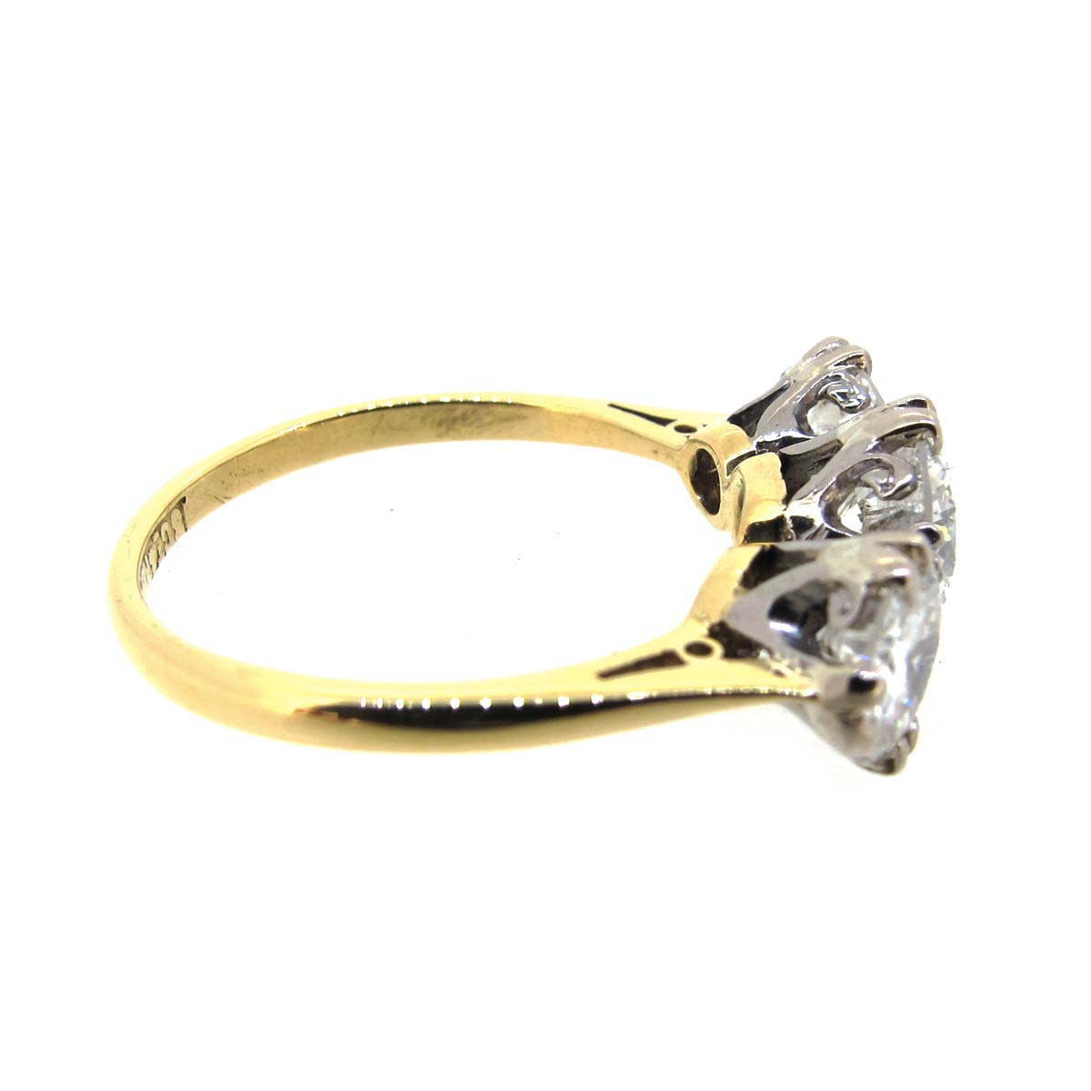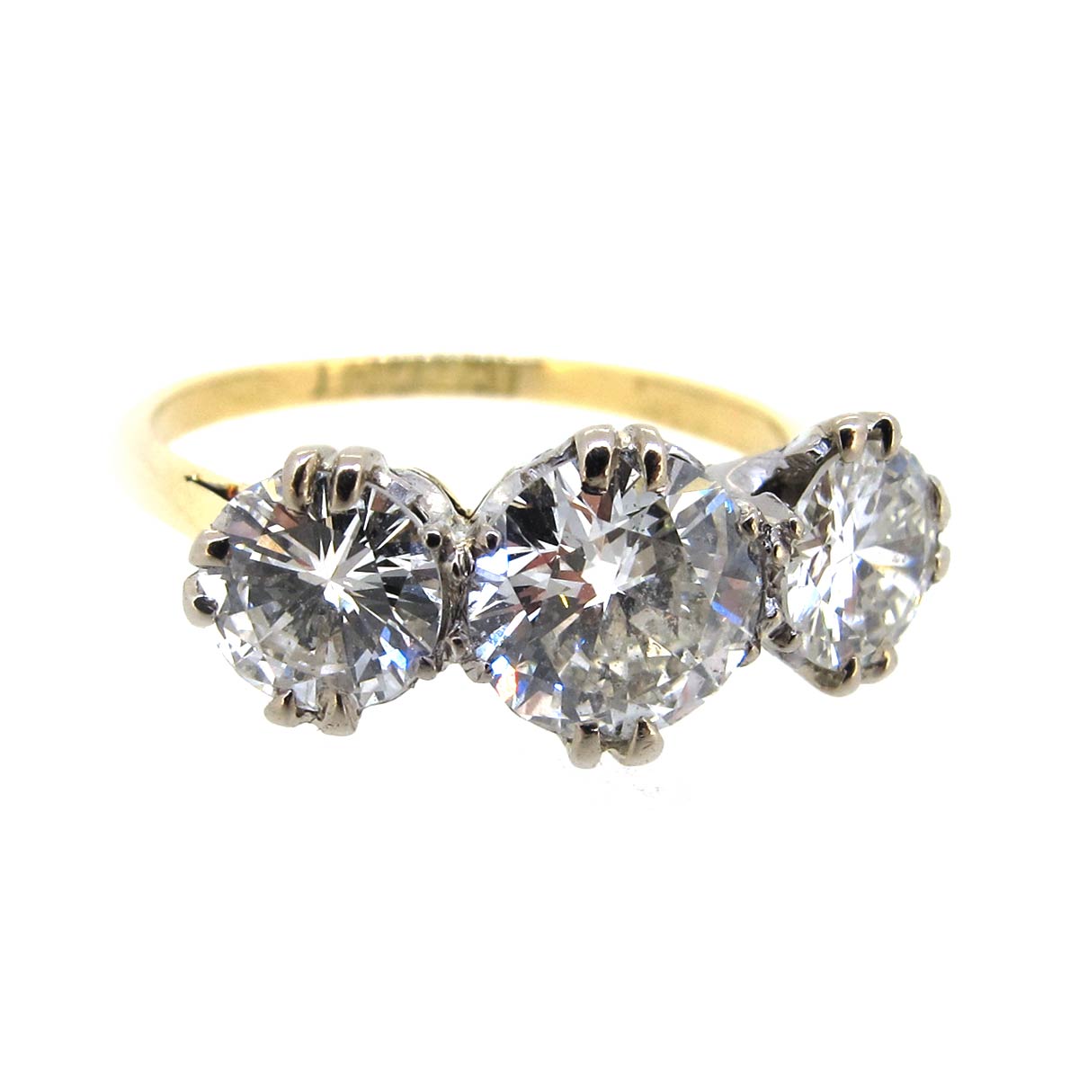 Circa 1930s/ 1940s 3 stone diamond trilogy ring set in 18 carat gold & platinum. Total diamond weight approximately 1.90 carats. Central diamond approximately .90cts with .50cts to either side. Average G/H colour, VS clarity.
