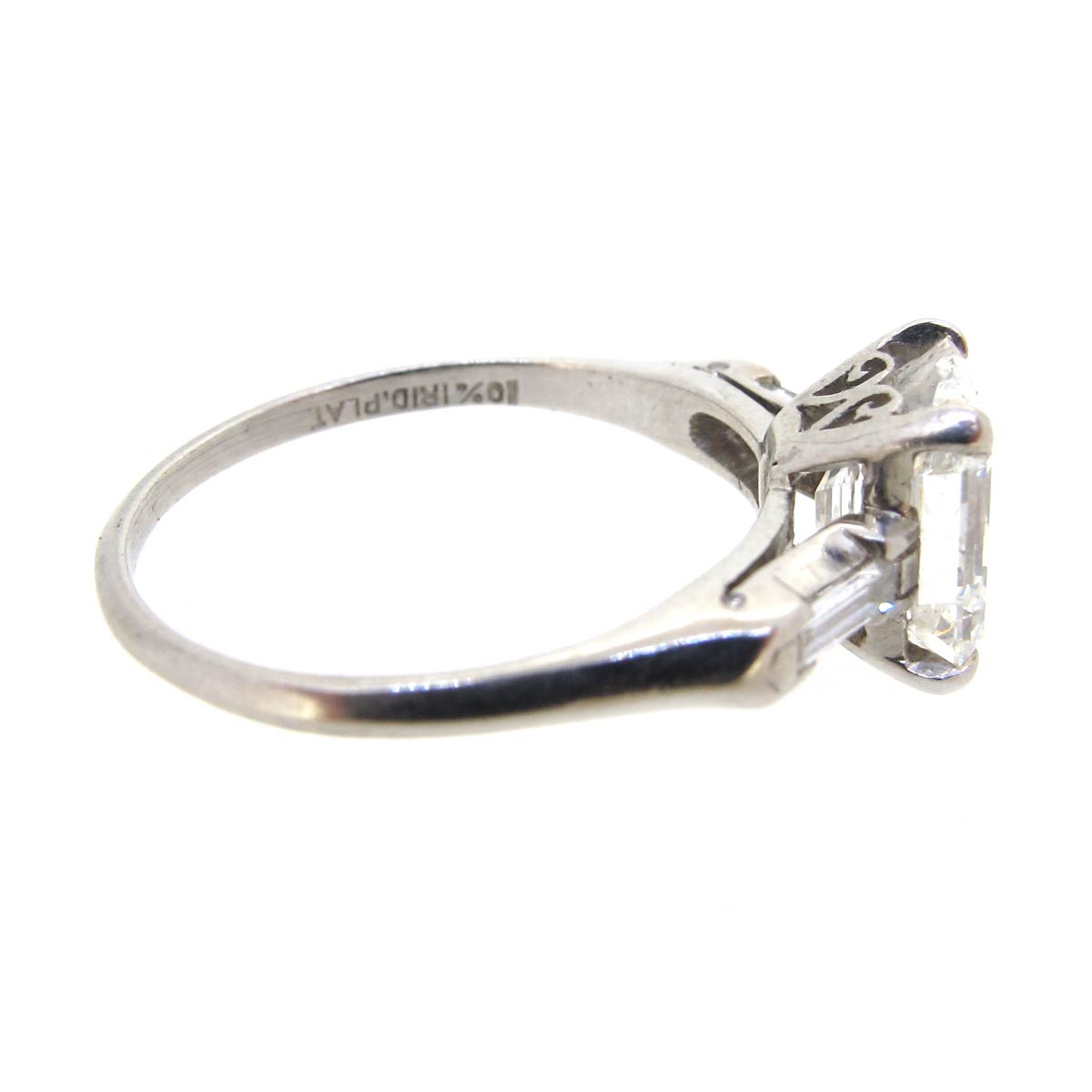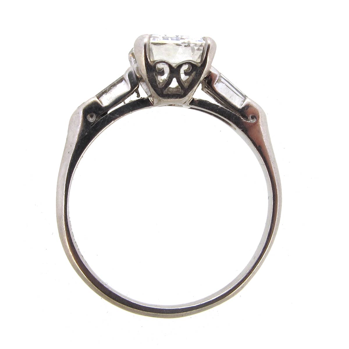Vintage Art Deco style emerald cut diamond ring with baguette cut diamond shoulders. Set in platinum. Central diamond approximately 1.75 carats, G colour, VS clarity.