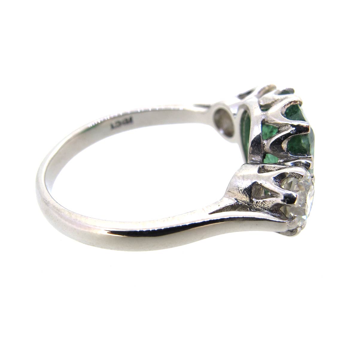 Vintage emerald & diamond 3 stone trilogy ring. Set in 18 carat gold. Central emerald weight 2.76 carats, total diamond weight 1.10 carats.