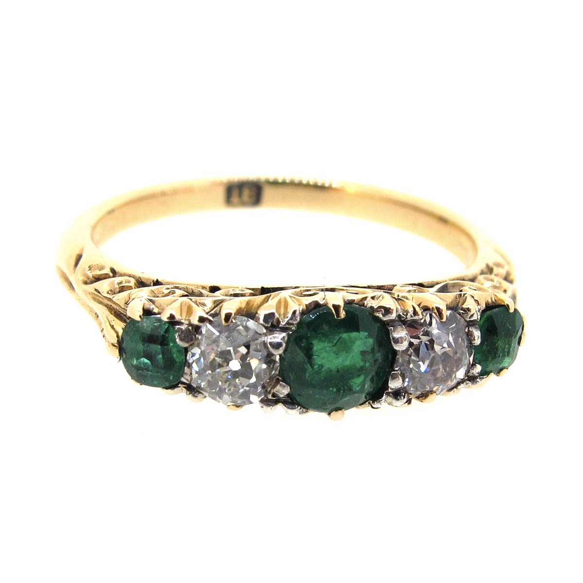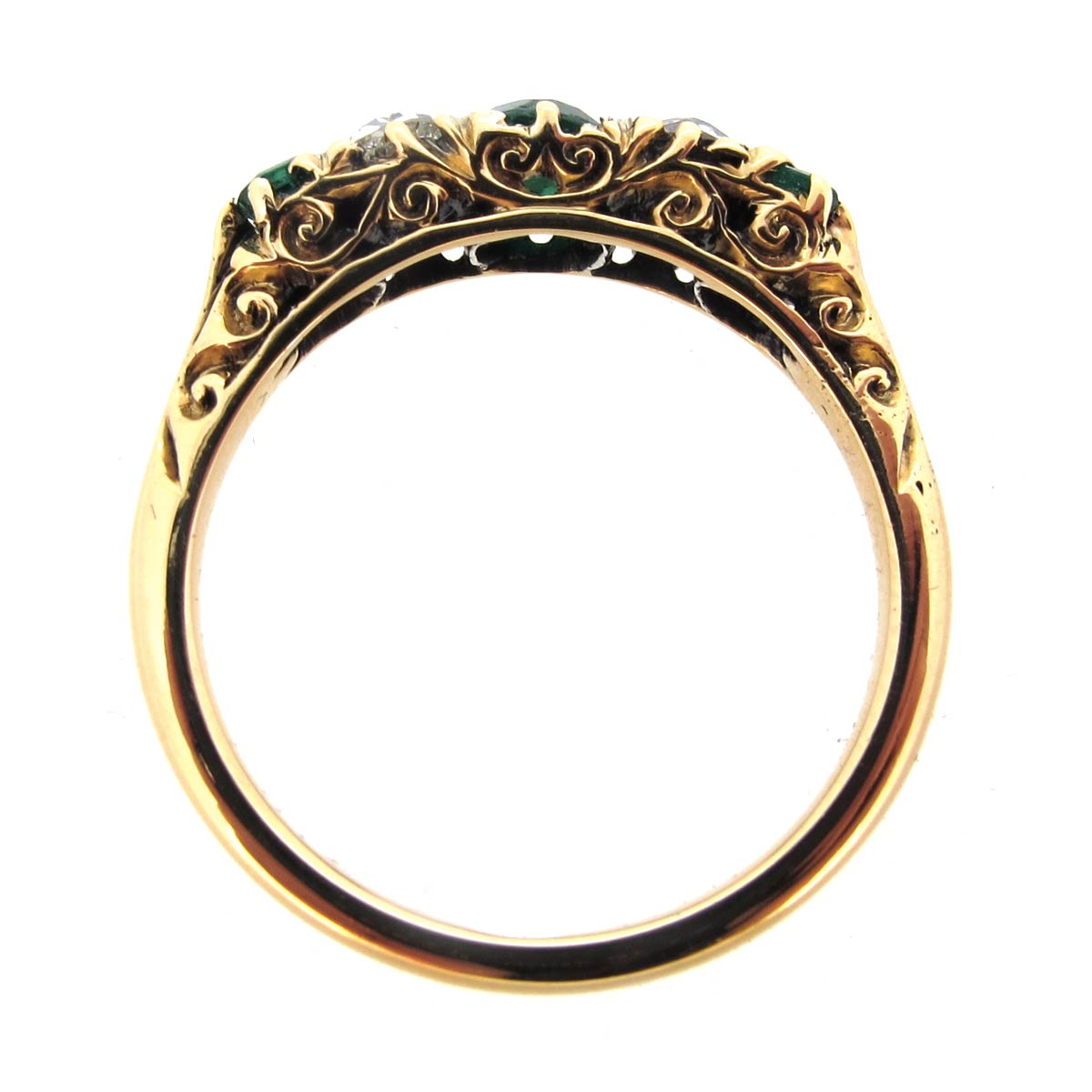 Antique Victorian 18 carat gold carved half hoop ring. Set with emeralds & diamonds.