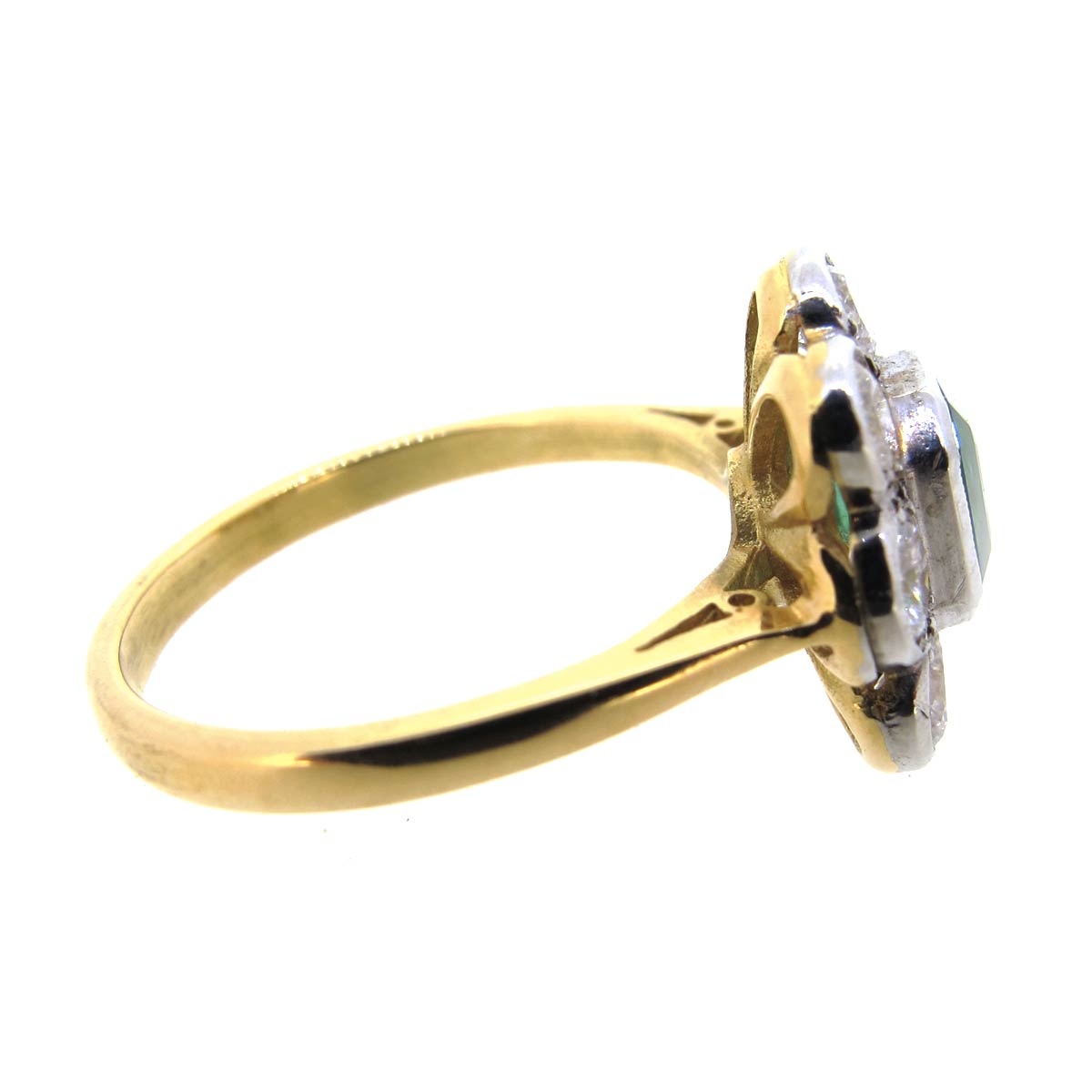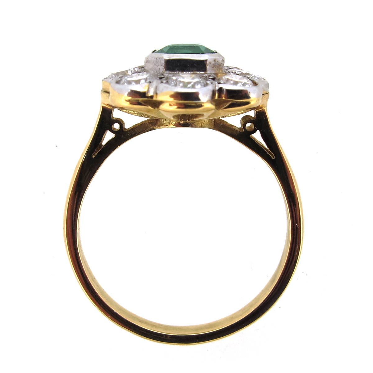 Emerald & diamond daisy cluster ring in 18 carat yellow & white gold. Central emerald cut emerald surrounded by 8 round brilliant cut diamonds.