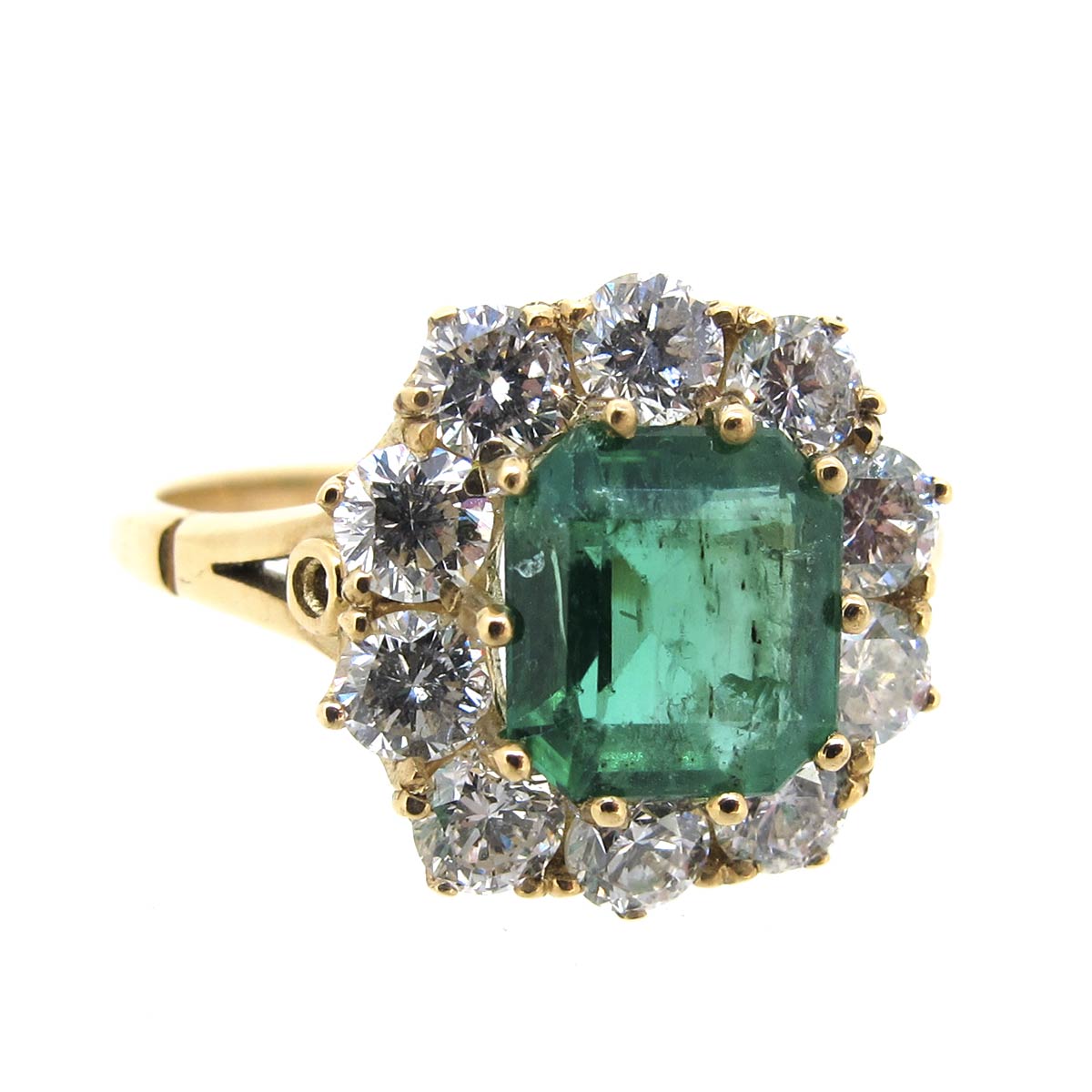 Emerald & diamond cluster ring set in 18 carat gold. Central emerald cut emerald weighing approximately 1.50 carats surrounded by diamonds with a total estimated weight of approximately 1 carat.