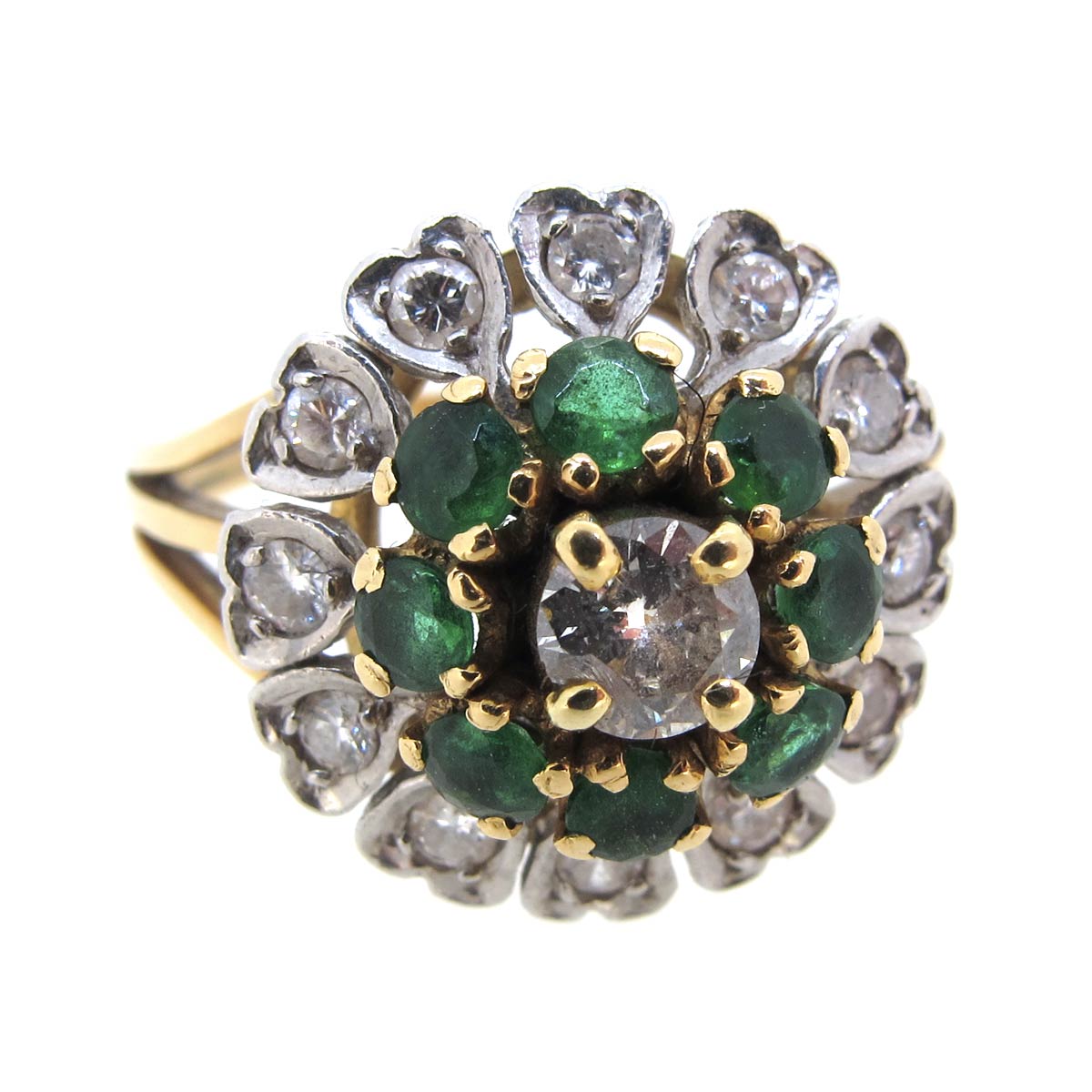 Vintage emerald & diamond triple cluster ring. Central round brilliant cut diamond of approximately .20 carats with a surround of emeralds & a further surround of heart set diamonds. Diameter 16mm. In 18 carat gold with three way split shoulders.