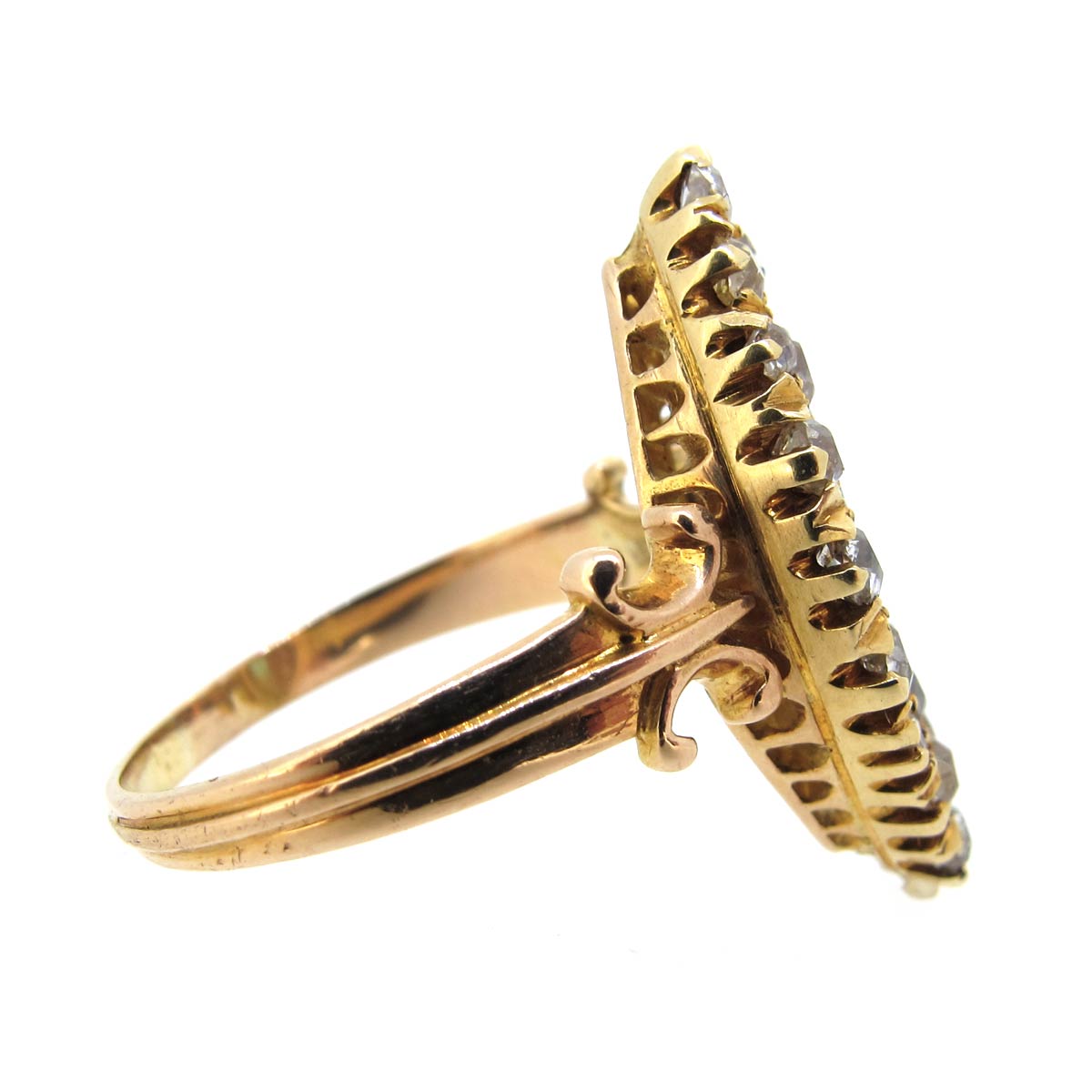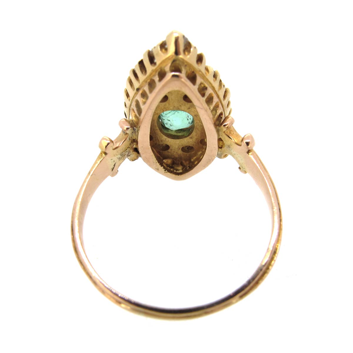 Antique Victorian emerald & old mine cut diamond navette/ marquise shaped ring. Size of navette 32.5 x 20.5mm.