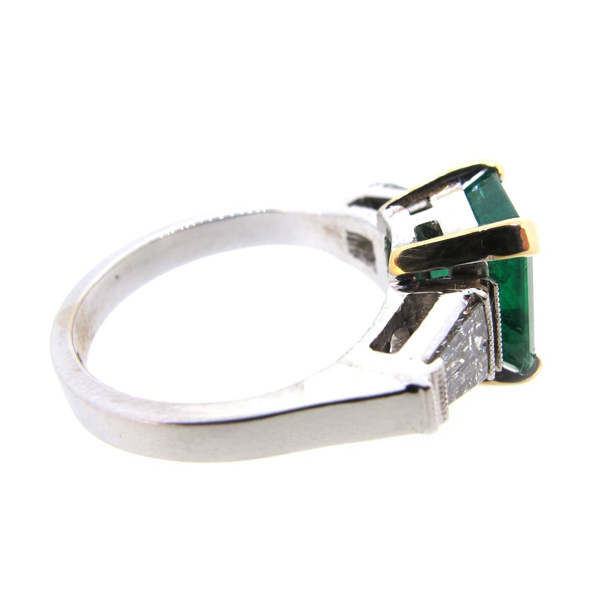 Emerald & diamond 3 stone ring set in 18 carat gold. Central emerald cut emerald measuring 8.5 x 7mm with 2 tapered baguettes set to either side.