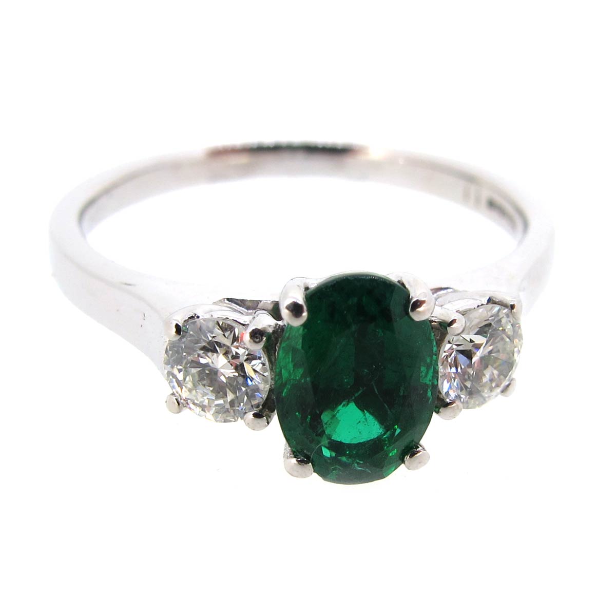 Emerald & diamond 3 stone ‘trilogy’ ring set in platinum.