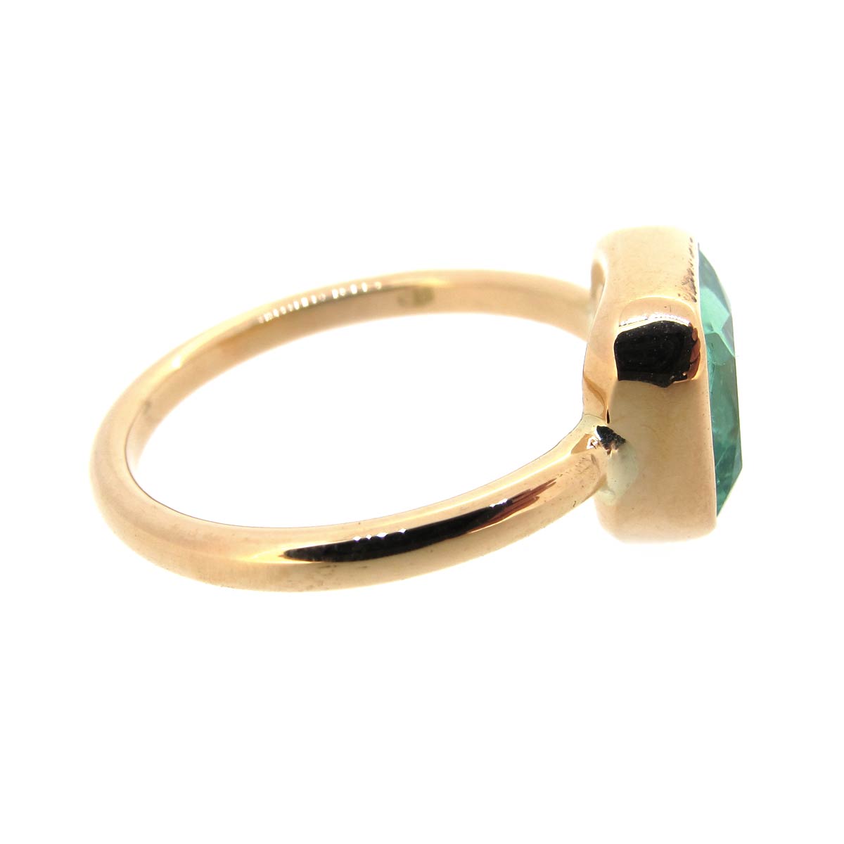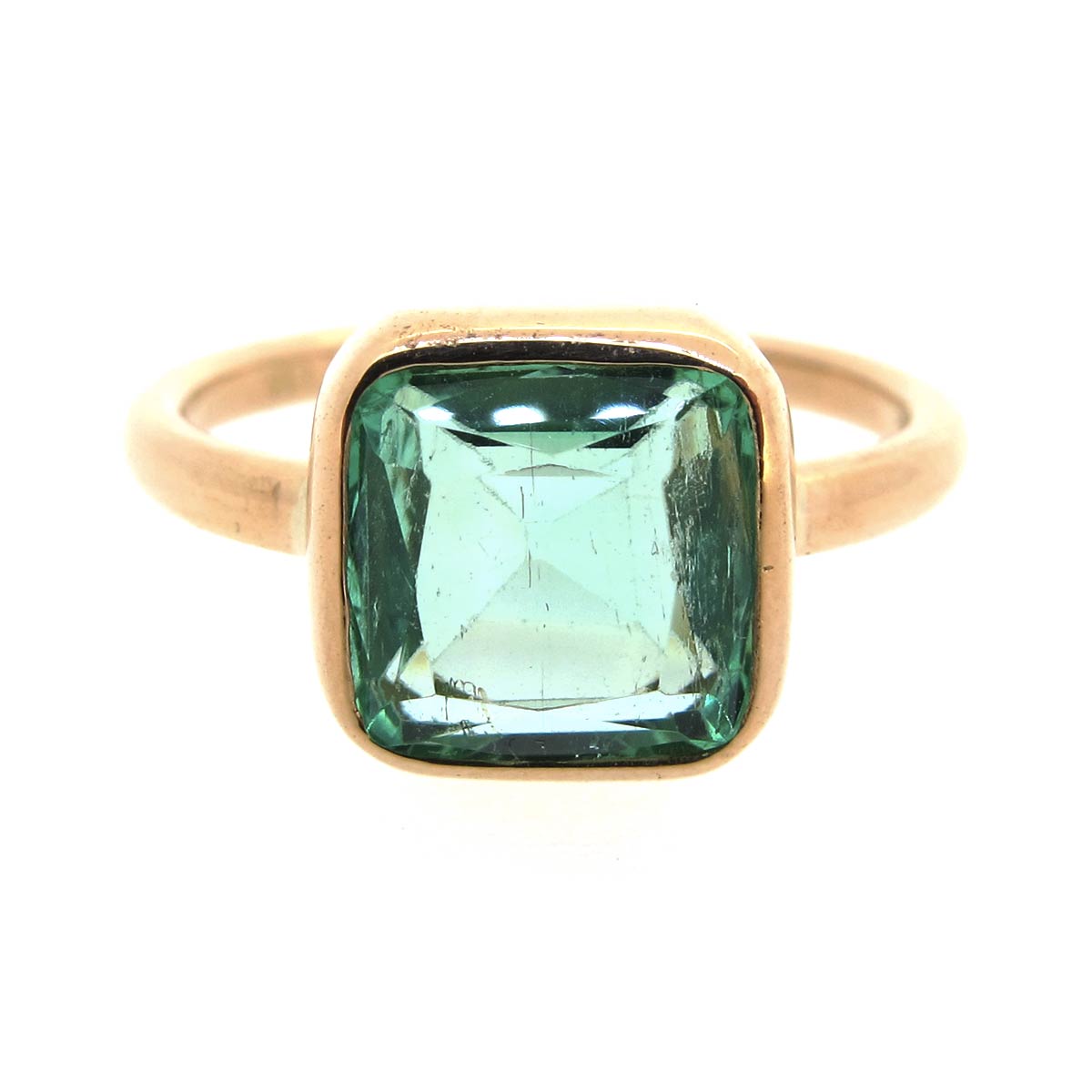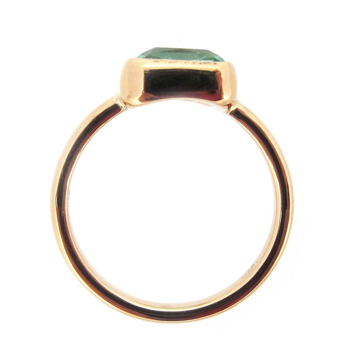 Single stone modified cushion cut emerald ring. In an 18 carat gold rub over setting. Emerald weight approximately 3 carats.