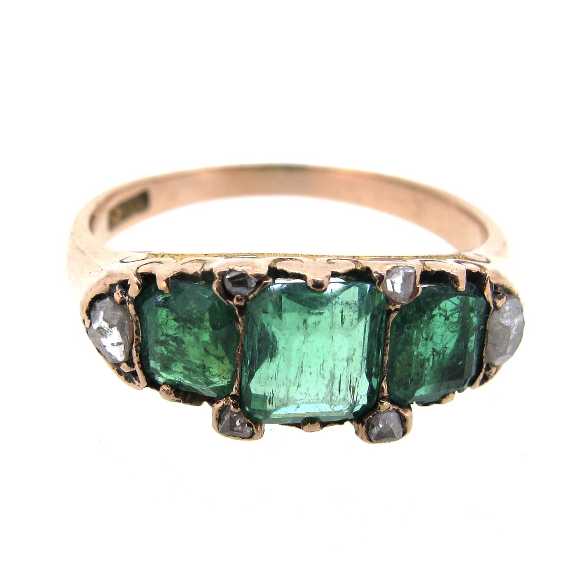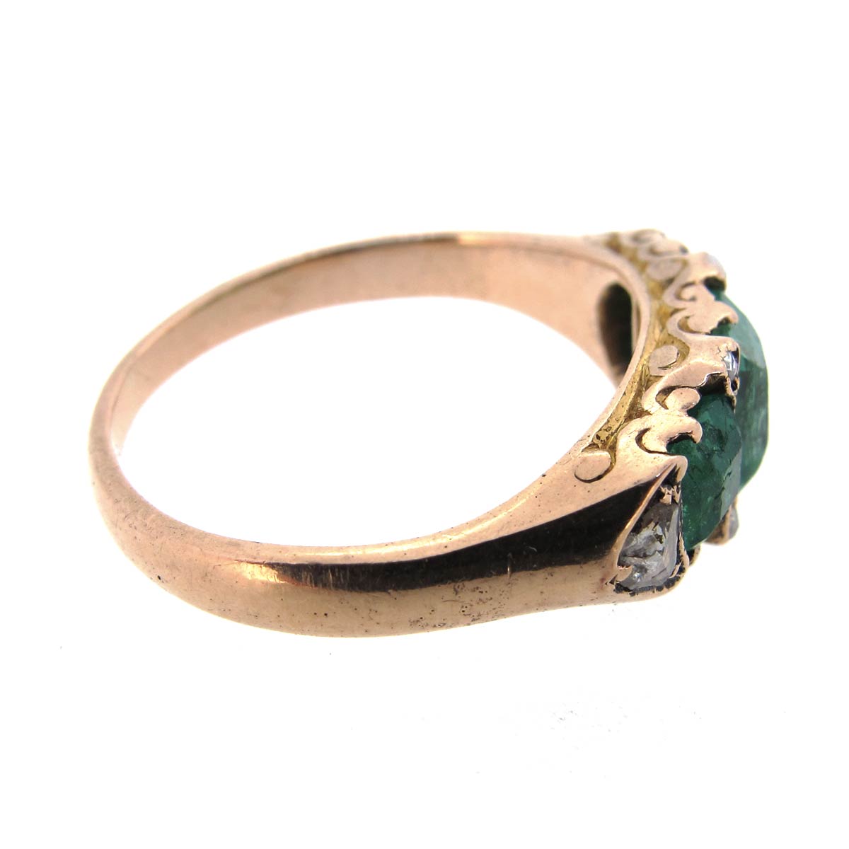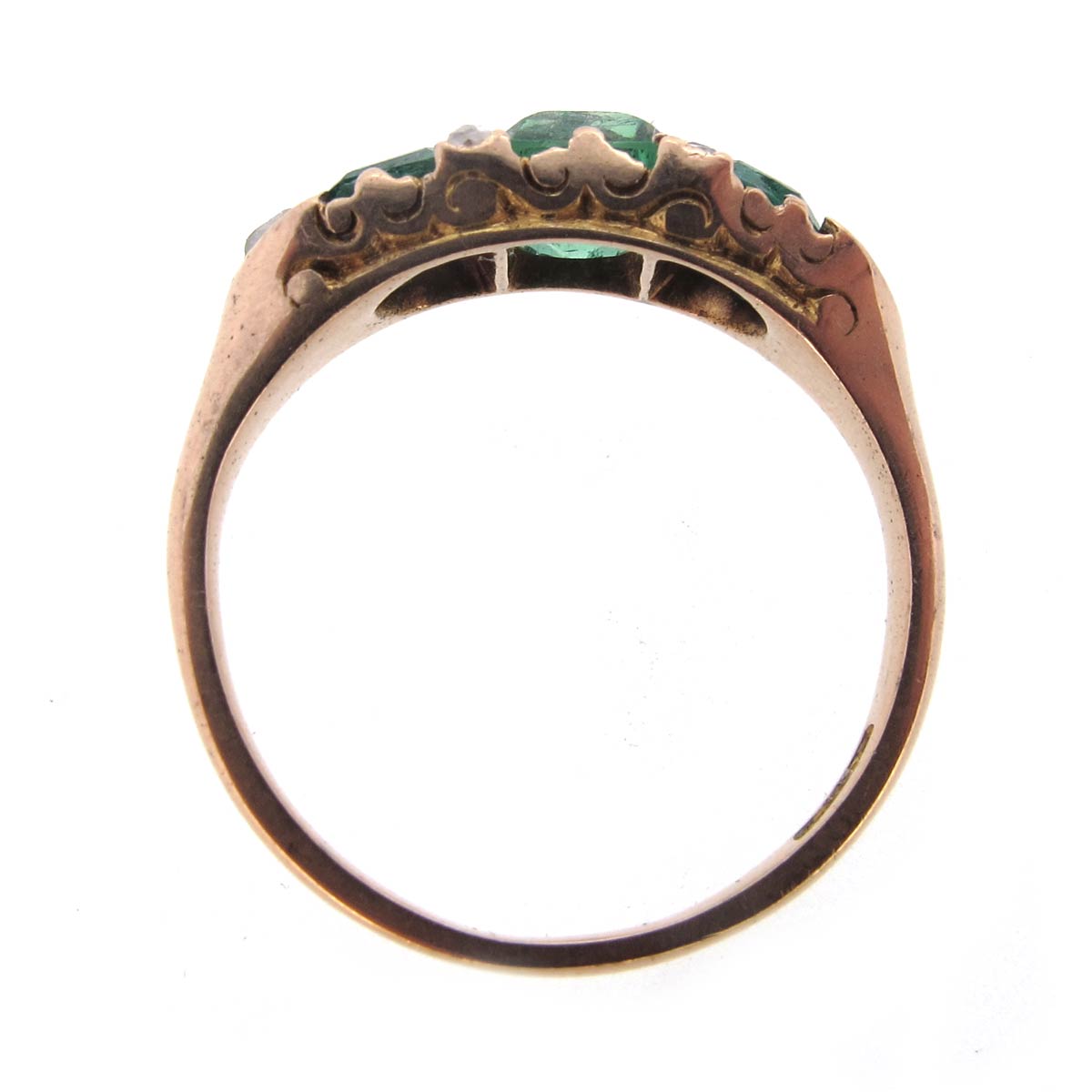 Antique Victorian carved half hoop 3 stone emerald ring. Set in 18 carat gold with accent diamonds to either end & between the emeralds.