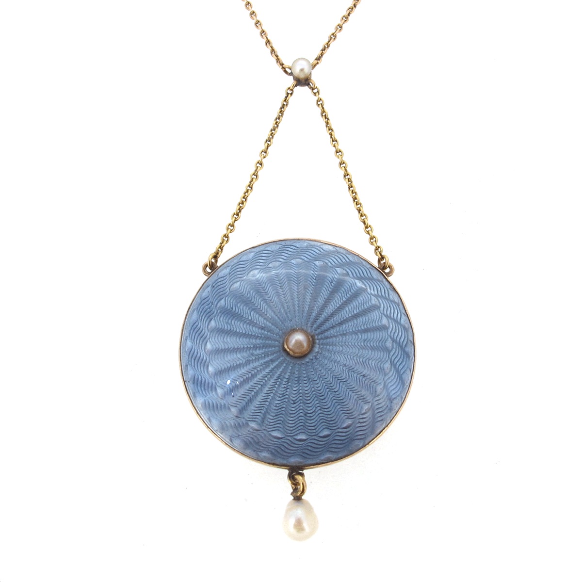 Antique gold, guilloche enamel & seed pearl Edwardian necklace. With open locket to the reverse. Length of chain 16″.